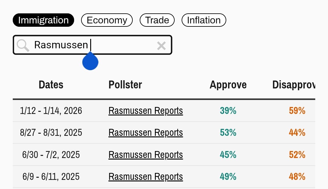IAPolls2022汇总的特朗普在移民议题上的支持率(1月各机构民调,括号内为较上次民调的变动;按政治倾向分类)。偏自由派 / 民主党倾向民调机构:美联社-美国公共事务研究中心(AP-NORC)支持:38%(=)反对:61%(+1)哥伦比亚广播公司/YouGov支持:42%(-2)反对:58%(+2)《纽约时报》/Siena学院支持:40%(-7)反对:58%(+6)偏保守派 / 共和党倾向民调机构:Rasmussen支持:39%(-14)反对:59%(+15)Cygnal支持:48%(-9)反对:50%(+9)相对中立民调机构。Strength in Numbers支持:44%(-2)反对:52%(+2)《华尔街日报》支持:48%(=)反对:52%(+1)Morning Consult支持:49%(+2)反对:44%(-2)为海外华人提供有价值的信息与分析,更多内容和全文可在蓝天、电报、x查找causmoney,或直接谷歌搜索caus.com