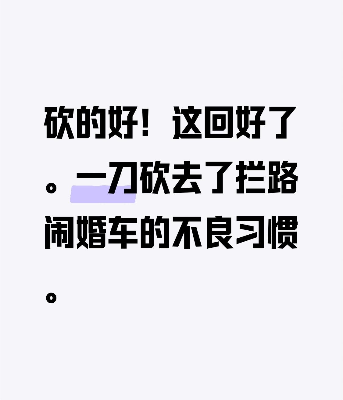 现在一些拦婚车索要财物的行为真的太过分了,完全就是不良陋习。像河北廊坊那对新人,婚车刚要出停车场,就被一群人拦住,为首中年男人张口就要50条烟,不给就不依不饶,这不是趁喜打劫吗?还有河南郸城多名老人组团用三轮车拦婚车讨红包,“撵好”习俗都变味成耍赖抢钱了。 好在现在有新人不惯着这些“拦路虎”,自损八百也要伤敌一千。这一刀砍得好啊,砍去了这些拦路闹婚车的不良习惯,让婚礼回归应有的喜庆与安宁,希望这种风气能越来越少。