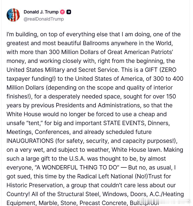 【黄金时代】川普叹息,因为政敌诉讼,白宫扩建不得不暂时叫停!川普:除了其他所有工作之外,我还在建造世界上最宏伟、最美丽的宴会厅之一,耗资超过3亿美元,全部来自伟大的美国爱国者的捐款。从一开始,我就与美国军方和特勤局密切合作。这是一份献给美国的礼物(零纳税人资金!),价值3亿至4亿美元(具体金额取决于内部装修的规模和质量!),为美国提供了一个急需的场所。历任总统和政府150多年来一直渴望拥有这样一个场所,这样白宫就不必再被迫在潮湿且易受天气影响的白宫草坪上,使用廉价且不安全的“帐篷”来举办大型重要国事活动、晚宴、会议、研讨会以及已安排好的未来就职典礼(出于安全、安保和容量方面的考虑!)。几乎所有人都认为,向美国捐赠如此巨额的礼物是“一件非常棒的事”——但事实并非如此,我又一次被起诉了,这次是激进左翼的“国家历史保护信托基金会”(No! Trust for Historic Preservation),一个对我们国家漠不关心的组织!所有的结构钢材、门窗、空调/供暖设备、大理石、石材、预制混凝土、防弹门窗玻璃、防无人机屋顶等等,都已经订购(或即将订购),现在根本没有任何实际可行的办法可以撤回。一切都太迟了!为什么这些阻挠者和捣乱分子不早点提起他们毫无根据的诉讼?国会从未试图阻止宴会厅项目,也从未想过要阻止它!每个人都知道白宫正在发生什么——一份献给美利坚合众国的伟大、盛大、美丽的礼物!对于那些感兴趣的人来说,这座小小的东翼多年来被“糟蹋”了,几经改建,如今已与最初的建筑面目全非。那些所谓的“文物保护主义者”,他们的资金来源五花八门,不应该被允许阻止我们伟大的白宫这项急需的扩建工程。白宫地处特殊地位,总统从未需要获得许可即可对其进行任何改动或扩建,无论扩建工程多么庞大(多么重要!)。此外,此次扩建工程的设计、同意和批准均来自美国军方和特勤局的最高层。不幸的是,仅仅是提起这场荒谬的诉讼就已经暴露了这一此前高度机密的事实。在如此多的工程已经下达指令并完成的情况下,此时叫停工程将对白宫、我们的国家以及所有相关人员造成毁灭性打击。感谢您对此事的关注!唐纳德·J·特朗普总统美国和欧洲当代史川普主义研究热点现场海外新鲜事