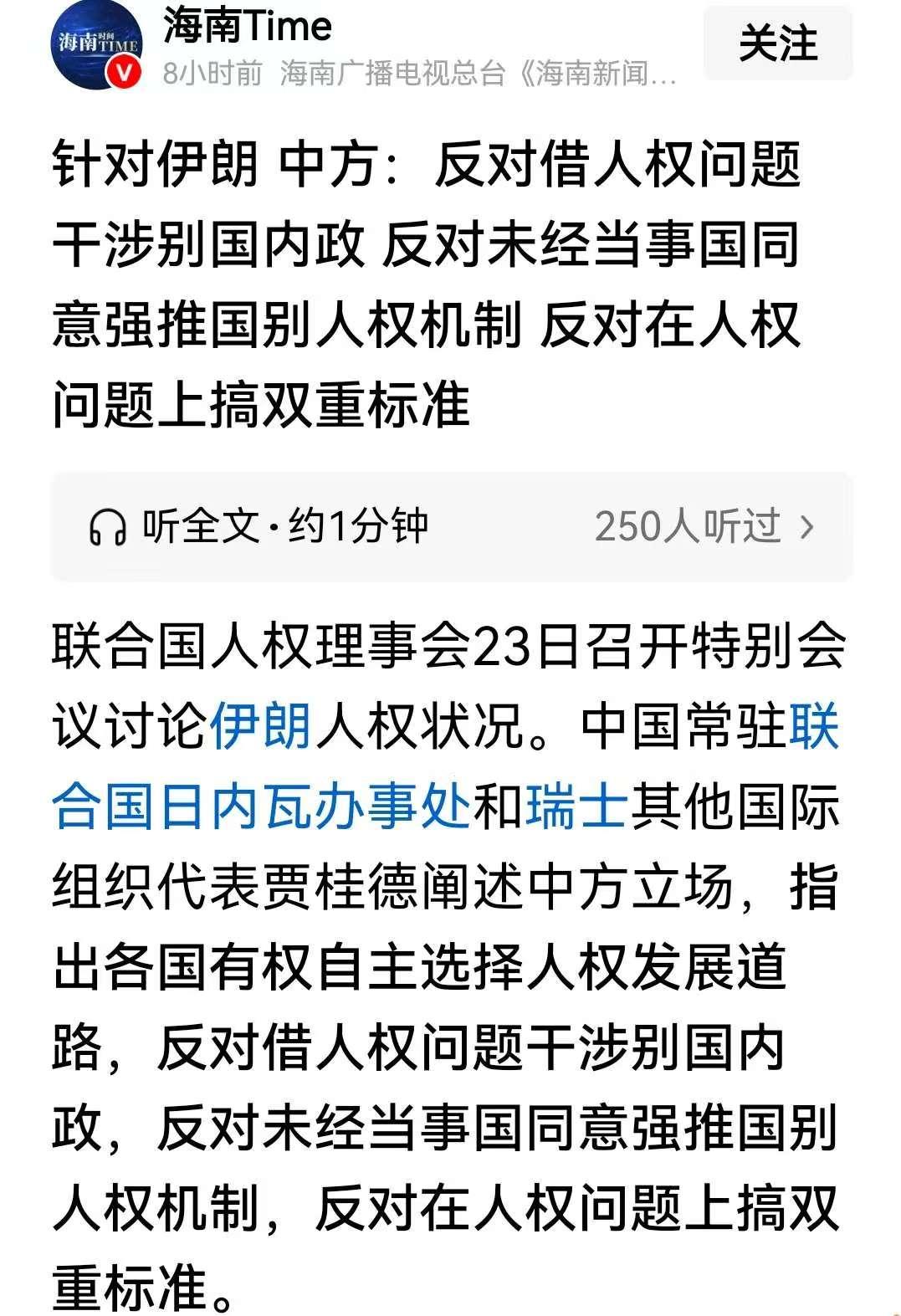 针对伊朗 中方表态:联合国人权理事会23日召开特别会议讨论伊朗人权状况。中国常驻联合国日内瓦办事处和瑞士其他国际组织代表贾桂德阐述中方立场,指出各国有权自主选择人权发展道路,反对借人权问题干涉别国内政。 评二句,有没有人权,伊朗人民最有发言权,过得好不好?由伊朗人民说了算。伊朗的事由伊朗人民当家做主解决。他国(指以美国为首的西方国家)无权干涉,更无权说三道四,指手画脚,长臂管辖,当人权教师爷,自己管好自己国家的事就好,首先看看自己,浑身化脓长疮不管,天天盯着别人脸上雀斑不放?美国先把自己屁股擦干净再来说别人吧?美国的枪支泛滥,每年死亡多少无辜生命?最起码的生命尊重都做不到?控制不了?谈人权不是好笑?不要老是把镜子拿岀来照别人,先照照自己!这不是睁眼说瞎话玩双标!