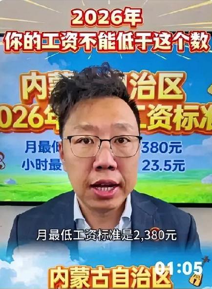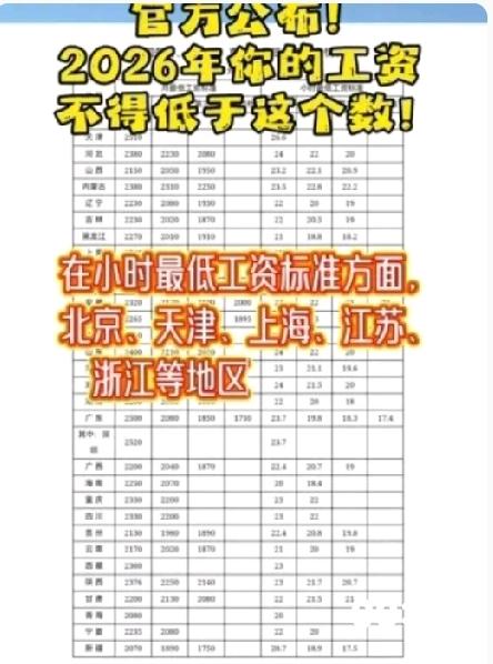 2026年你的工资可得注意了!人社部更新了最低工资标准:请记住你月工资的最低底数! 内蒙古最低工资标准的第一档是月薪2380元,小时工每小时23.5元。上海以2740元稳居全国第一,北京的小时工最高能拿到27.7元。 这年头,最低工资其实一直在偷偷往上走!想当年刚毕业找工作的时候,2000块一个月就能招到刚毕业的大学生,现在就连扫大街的大爷都瞧不上这个数了。不过话说回来,2380元在呼市能干嘛呢?交完房租之后,估计连一顿热乎乎的羊肉烧麦都舍不得点了。 更让人无奈的是,这个标准看着是涨了,但物价却跑得比兔子还快。昨天去菜市场转了转,一颗普通的白菜居然要15块钱,吓得我赶紧把购物车里的牛肉换成了豆腐,毕竟钱包不允许任性。但话说回来,有这个标准总比没有强,至少以后被老板克扣工资时,咱还能理直气壮地拿出这个数来跟老板说道说道。 你们当地现在最低工资是多少呢?够日常开销吗?听说南方有些工厂管吃管住,一个月还能拿到四五千,看完突然有点想收拾行李去南方工厂试试水了,你们有这想法吗?