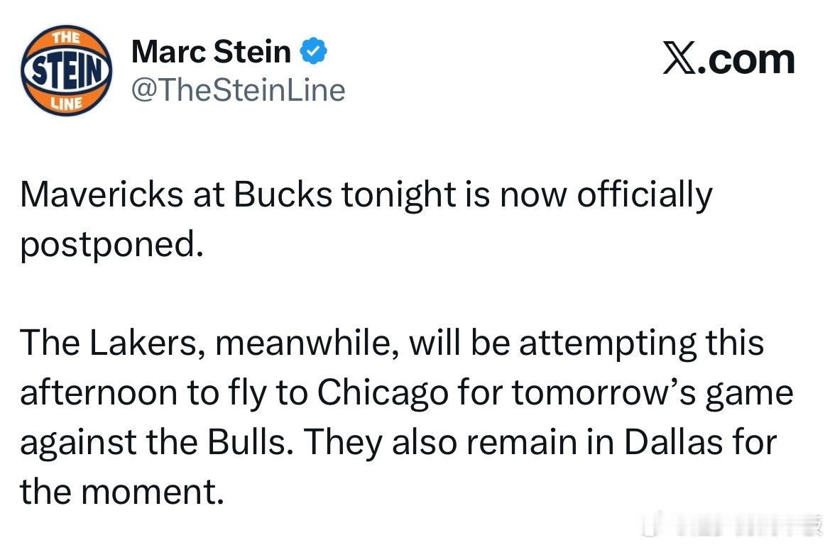 Stein: 受美国中部严重暴风雨天气影响,湖人目前仍然被困在达拉斯!湖人之前预定的前往芝加哥的包机已延误,他们仍在等待具体的起飞时间🛫湖人vs公牛