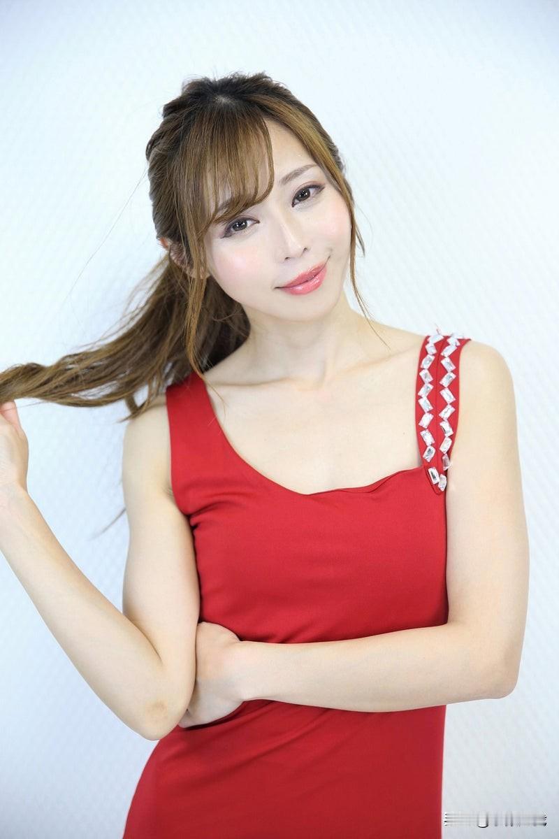 她身着一袭红色吊带长裙,裙摆侧开叉设计凸显修长美腿,搭配黑色高跟鞋,整体造型既性感又不失优雅。她的发型为高马尾,妆容精致,眼神温柔而自信,展现了她标志性的“清纯与性感并存”的个人风格。露肩红裙美女