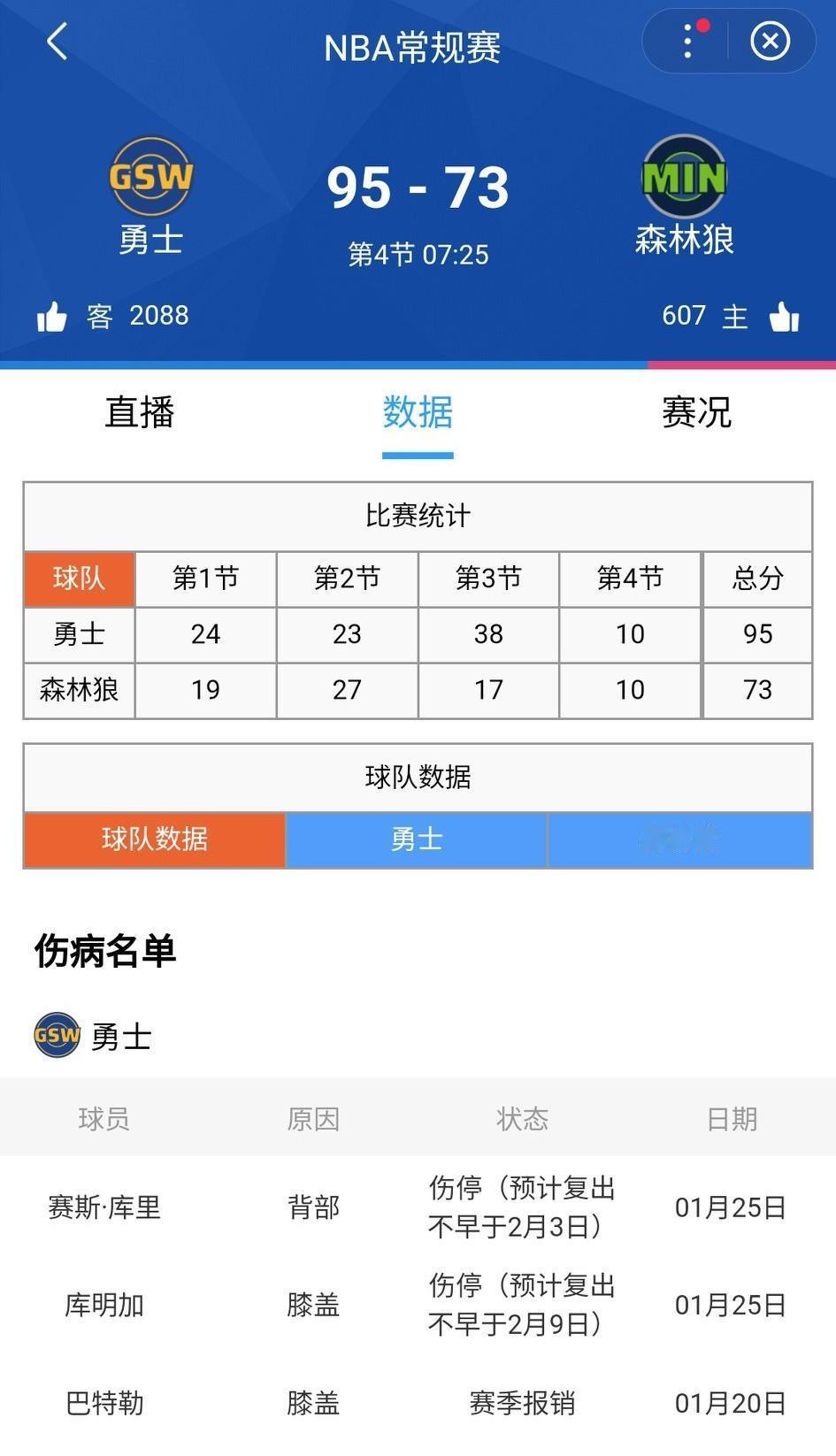 勇士变成勇三疯!勇士第三节38-17单节净胜森林狼21分,带着22分的领先优势进入第四节。 第四节还有8分41秒,勇士95-70领先森林狼。比赛已经花了,森林狼放手吧,直接上替补。