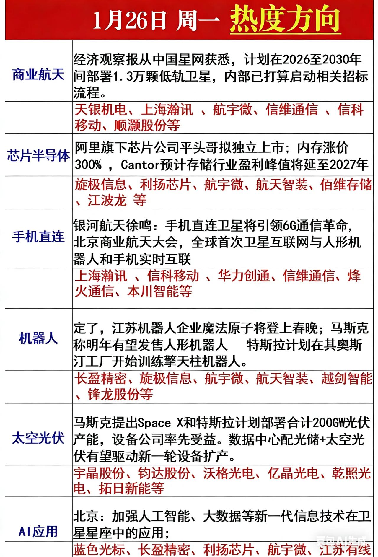 大盘上周二探底开始回升趋势,目标突破4190,如果突破不了可能会再来个4100回踩后继续突破。板块方面,机器人/商业航天/光伏/算力/AI应用/医药等周末利好较多,看主力进攻哪些方向了,个人比较看好低位的光伏和医药。 1、2026年央视春晚,唯一机器人不是宇树,而是魔法原子,新晋具身智能新贵。 2、2026年央视春晚唯一AI大模型和服务商,是火山引擎。背后内容服务是掌阅,技术服务是慧博,慧博正在收购宝德,一举跃入国内“AI+算力”第一梯队了。 3、中国低轨卫星部署5年规划出炉+北京商业航天政策+6G通信利好,商业航天看好冲高,没先手的不适合再追高了。 4. 马斯克看好太空算力和太空光伏能源,这些都是商业航天板块衍生出上最新题材概念,光伏短期都是消息和小作文,毕竟业绩不好,后面就看政策和业绩回暖了。 5. AI应用持续加速,百度发布文心助手关于春节现金红包活动的通知。百度APP还将作为首席AI合作伙伴合作《2026北京广播电视台春节联欢晚会》。 6. 印度爆发尼帕病毒,可人传人,尚无疫苗。看低位医药会不会来一波。