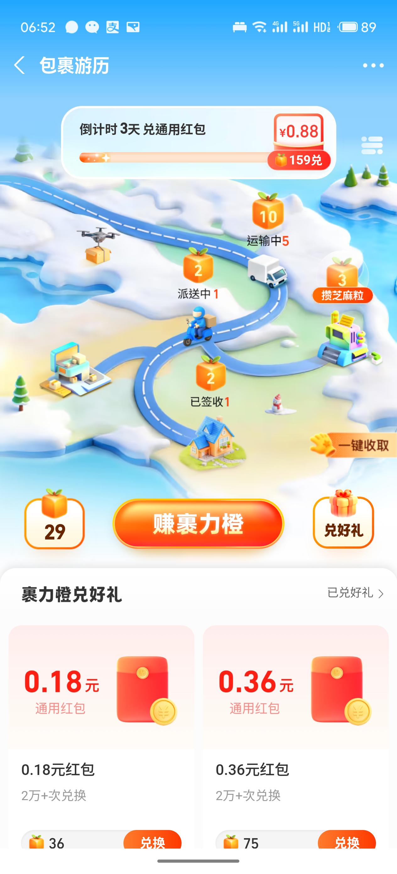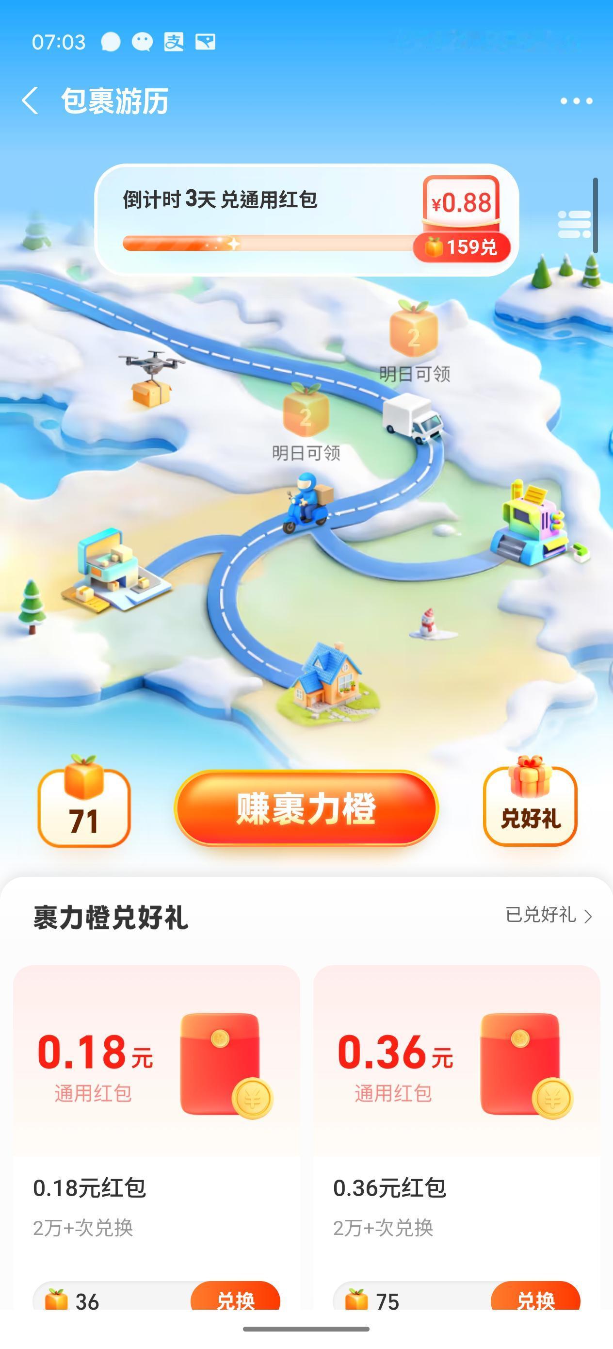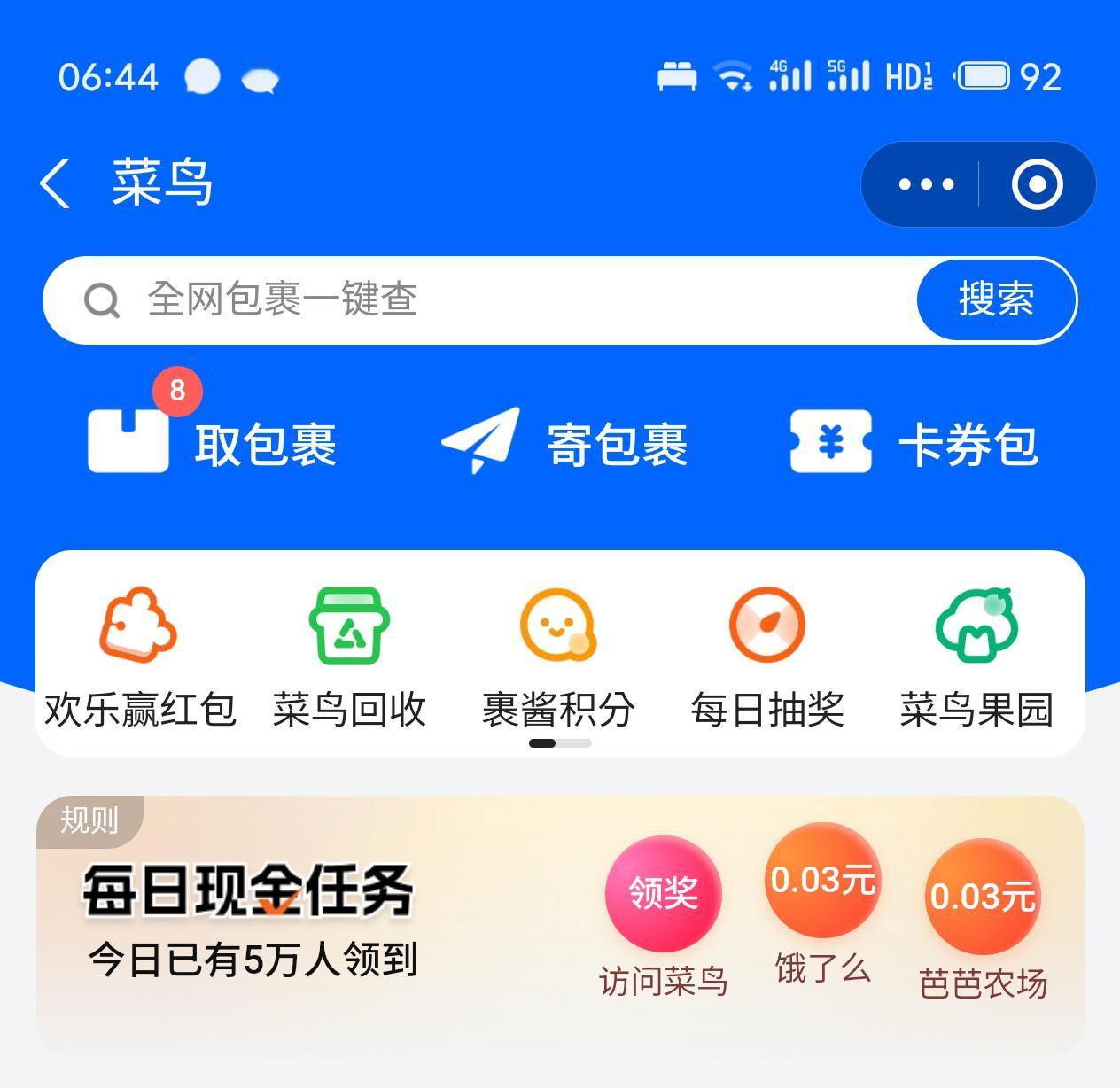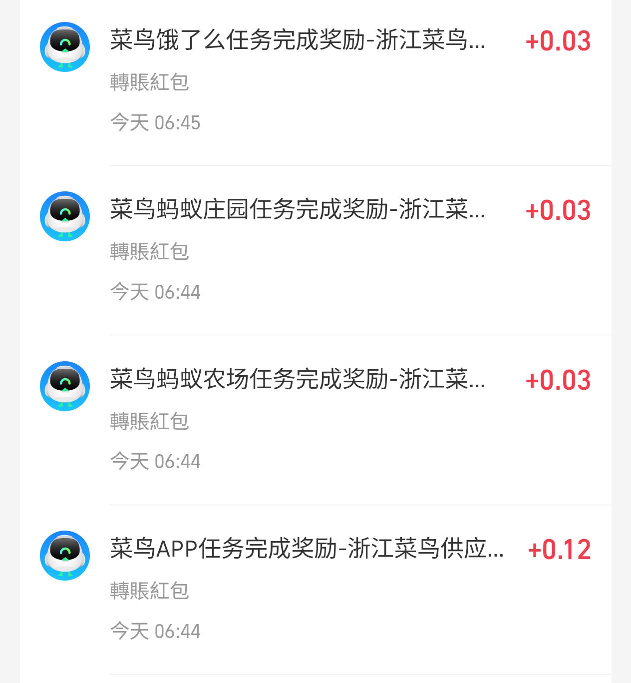 06:44起床后开始到07:03 可以收货 菜鸟的0.12+0.03+0.03+0.03=0.21 一淘的0.03+0.01+0.05=0.09 再加上我的快递的包裹历程,攒一攒再兑换吧 然后7点后可以天猫APP的签到