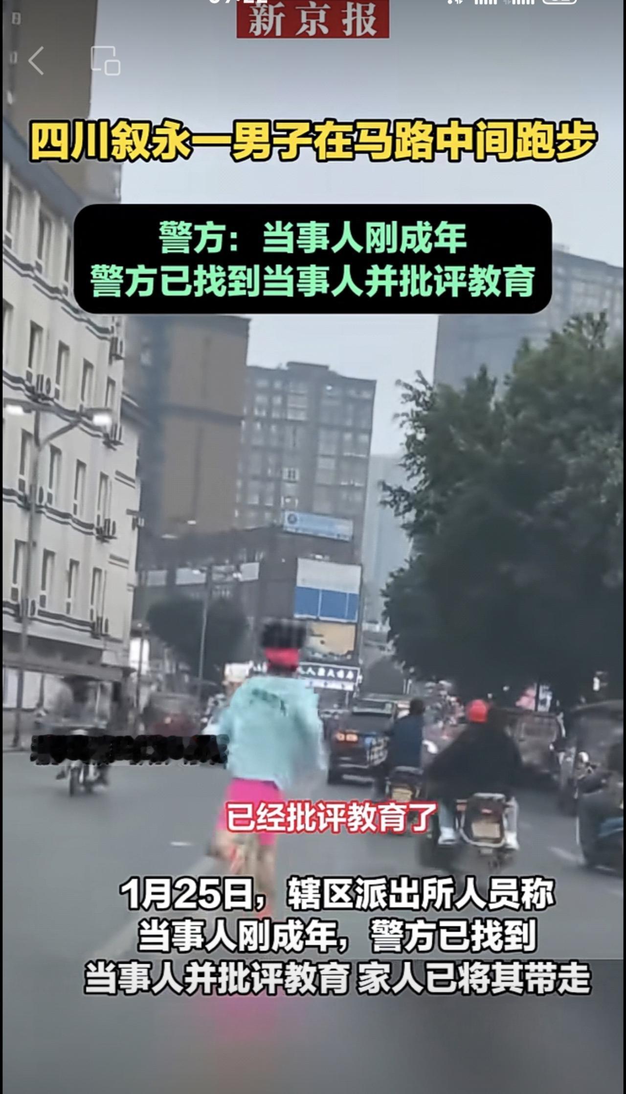 四川叙永一男子在马路中间跑步引关注 警方:已批评教育。