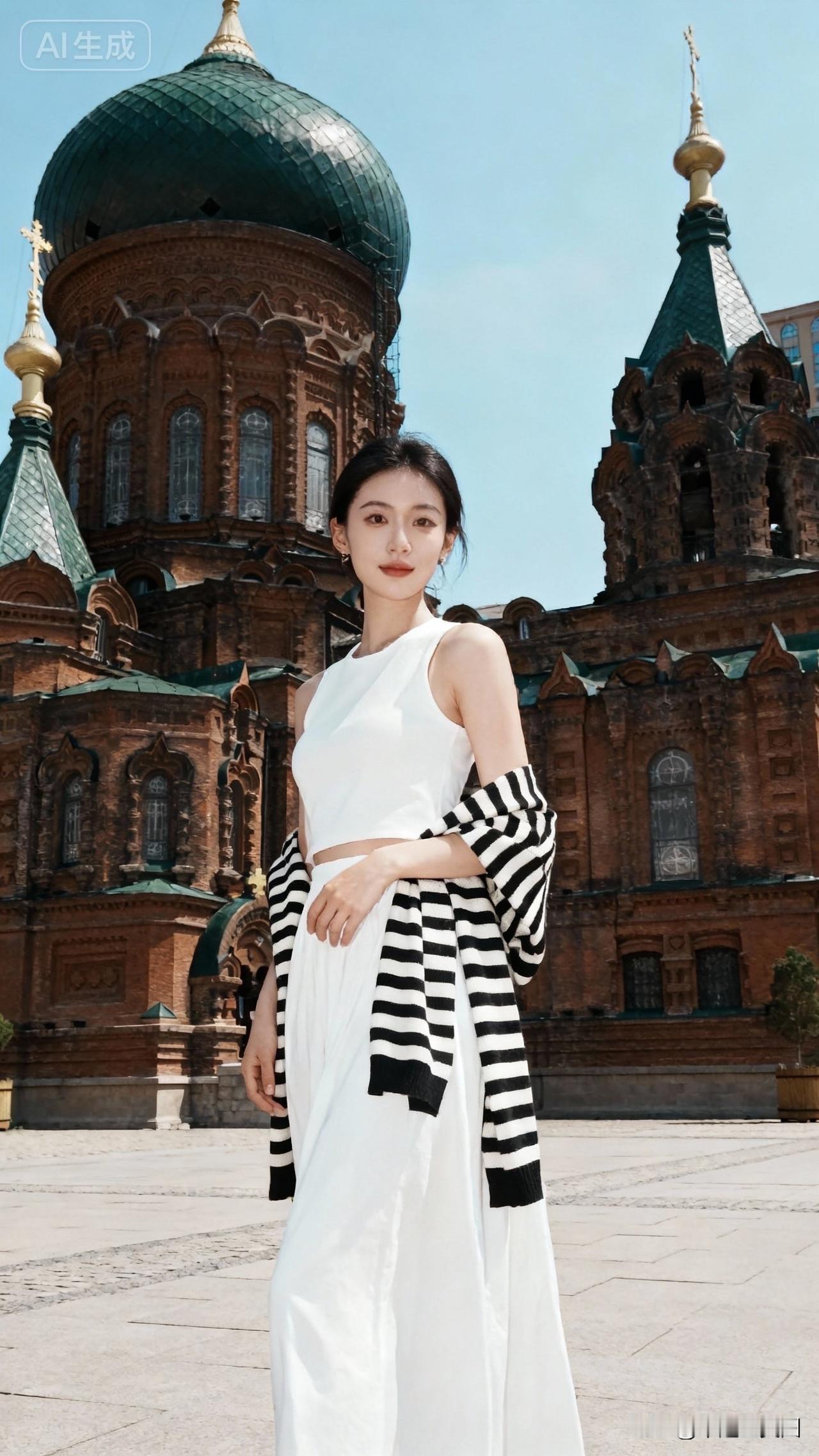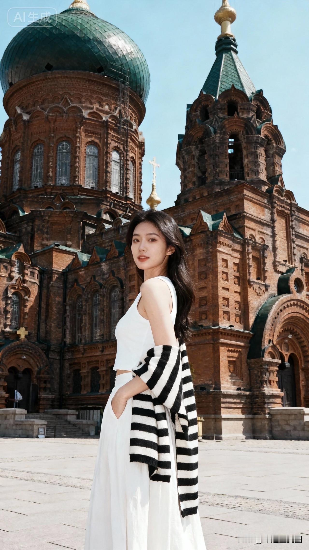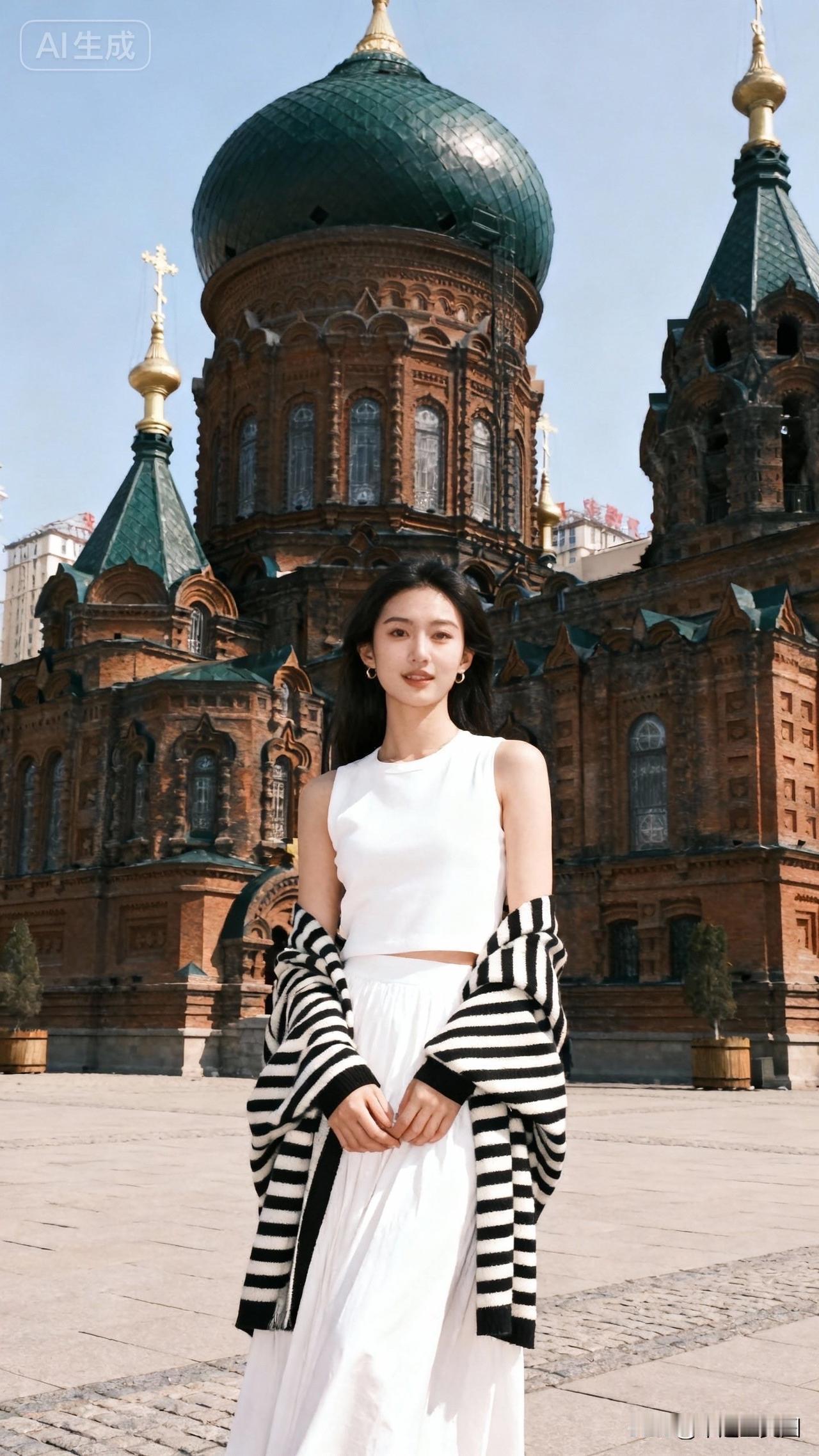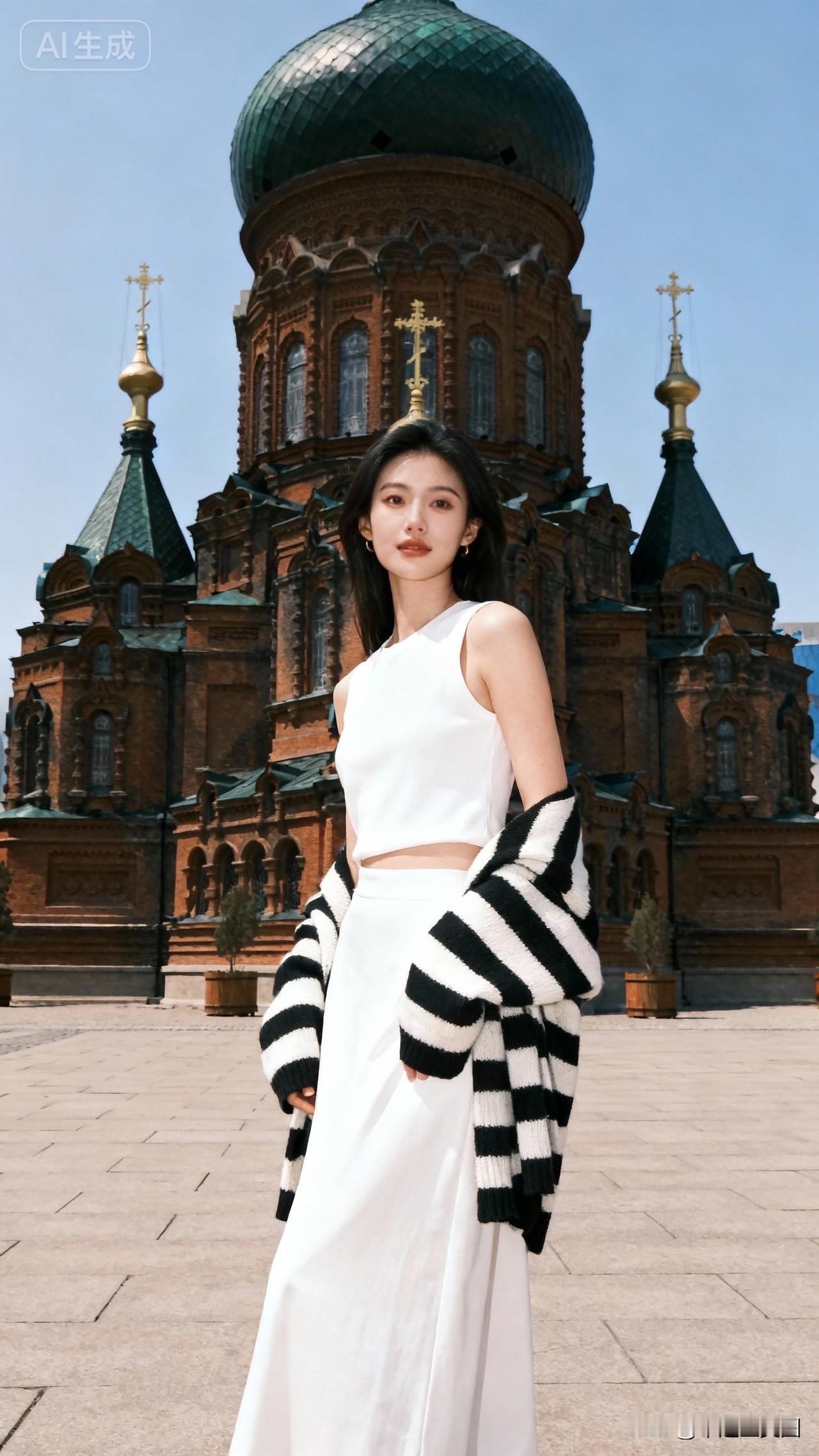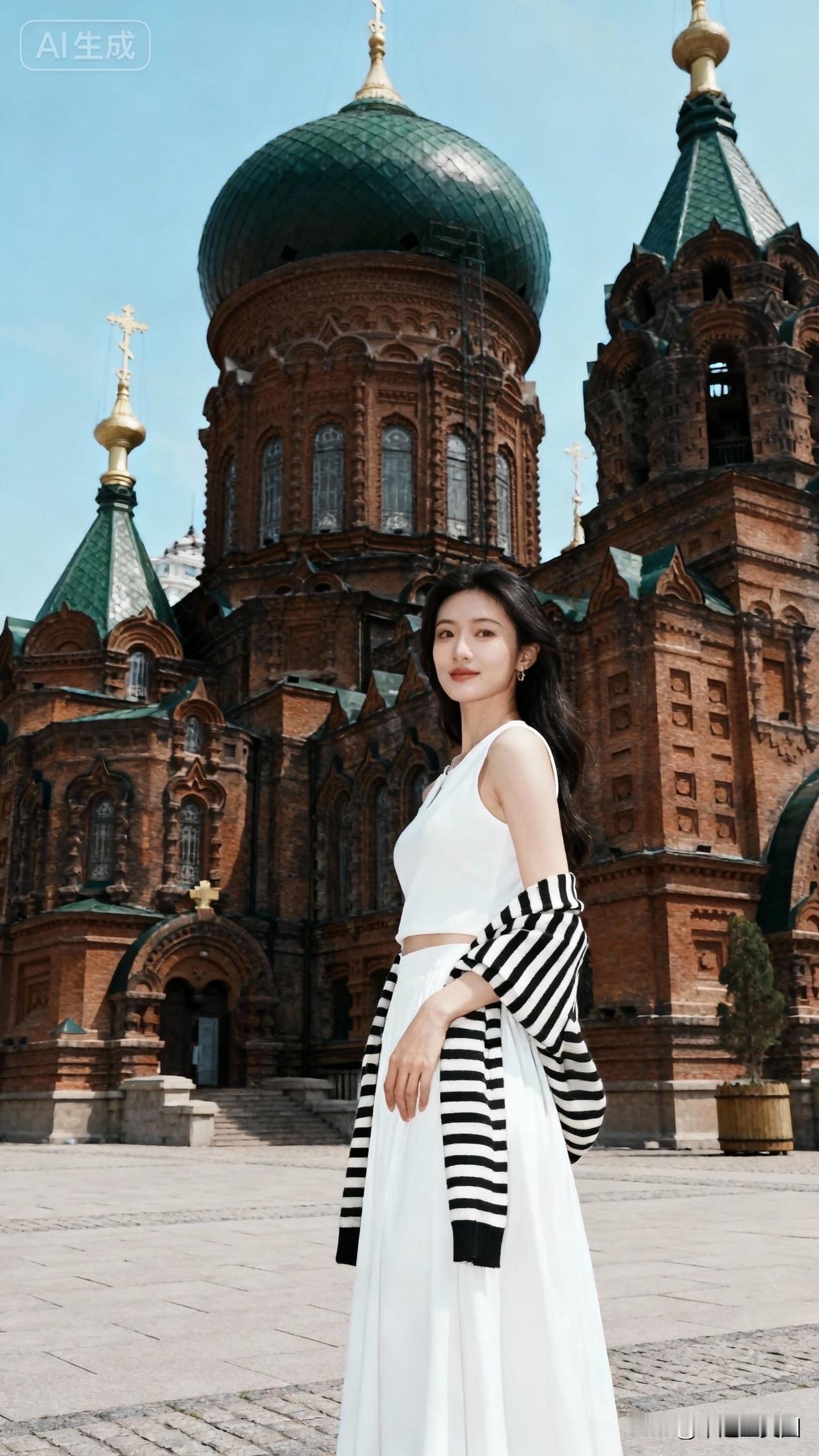 在东正教教堂前,白裙飘飘,黑白条纹外套,阳光明媚的一天。