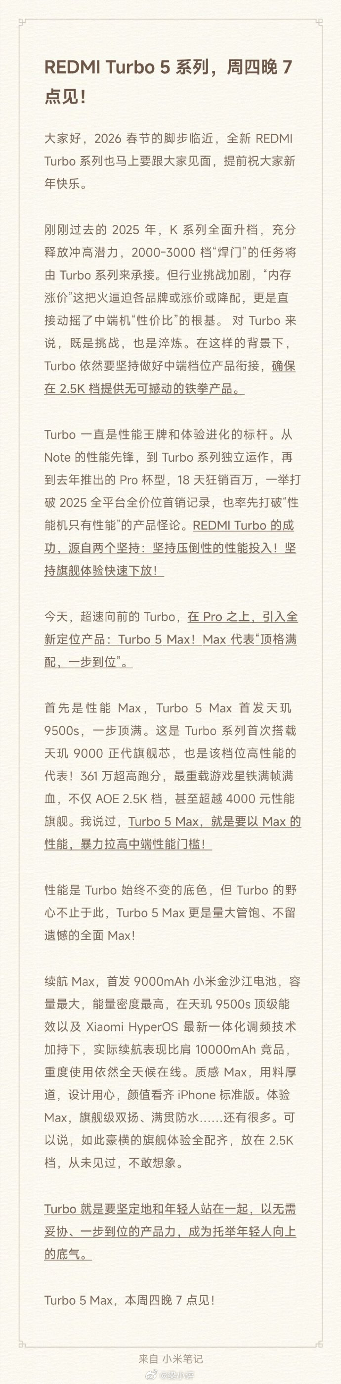 REDMI Turbo5 Max发布会官宣,1月29日晚7点,本周四,最大的看点,用上天玑9500s+9000毫安时电池组合,性能对标骁龙8 Gen5手机,续航领先同级手机,比Pro定位更高的Max手机,买手机预算2.5K档位等下这款