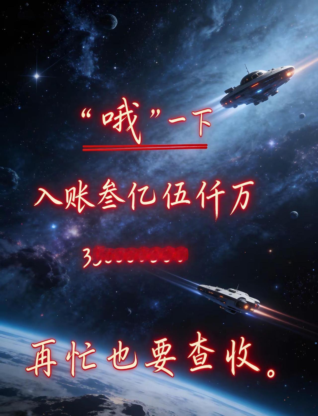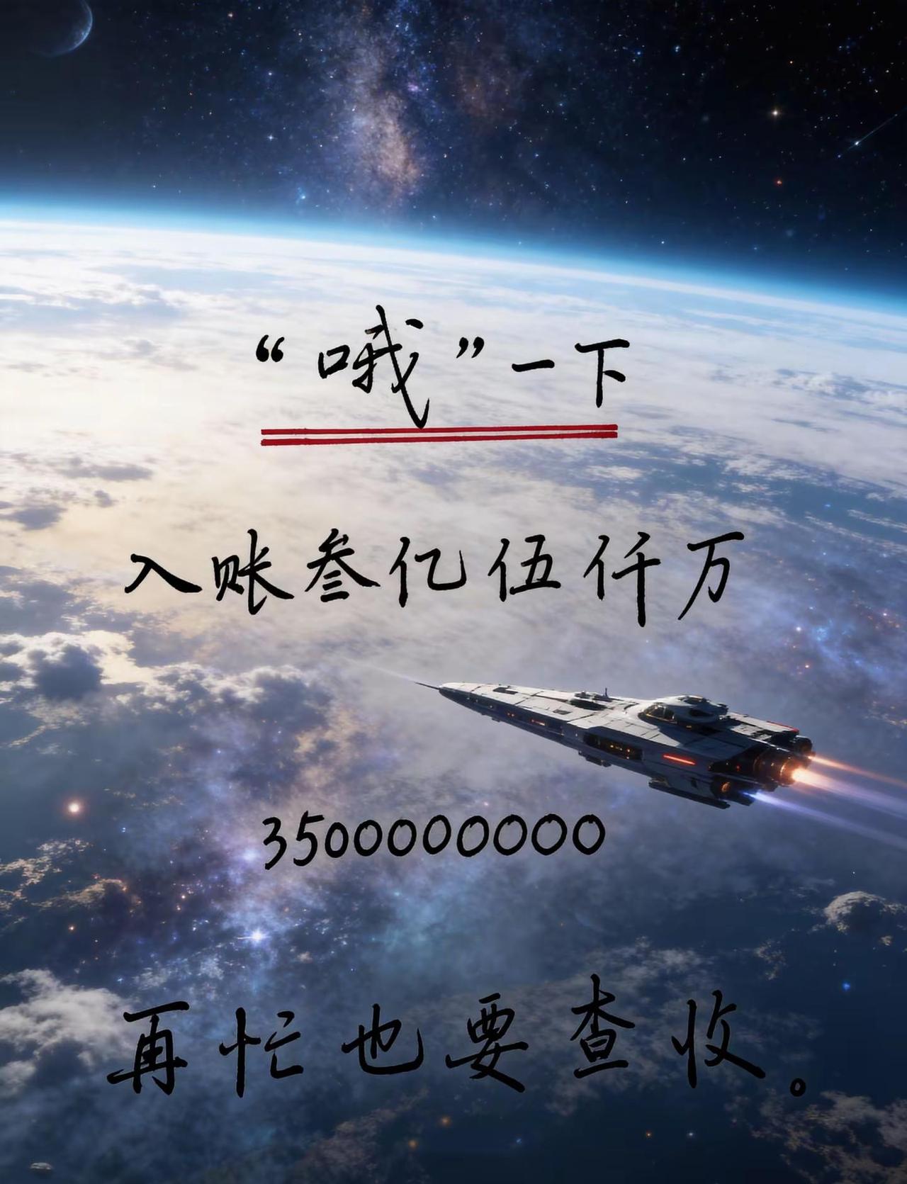 “哦”一下 飞船送来 叁亿伍仟入账。好运来到 发财 飞船 宇宙
