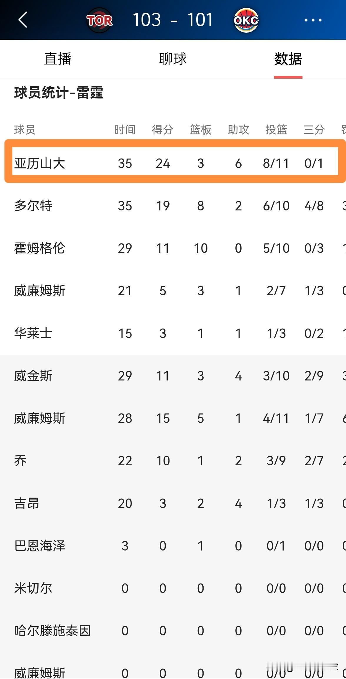 雷霆巨星亚历山大的出手次数真是太少了!在今天雷霆主场以101:103不敌猛龙的比赛中,亚历山大在手感火热的情况下竟然只出手了11次,他在首发出战的35分钟里,投篮11中8,其中三分球1中0、罚球10中8得到24分3篮板6助攻1抢断2盖帽,他的场上正负值为-3。 作为雷霆的进攻核心,亚历山大仅仅出手11次真是让人感到迷惑不解,他起码应该出手20次才对。