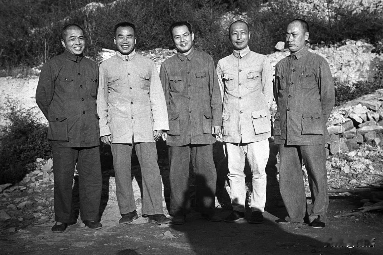 这是一张1944年在延安拍的老照片,站着的这五位都是后来大名鼎鼎的开国元帅。那会儿抗日战争还没结束,延安是咱们党的指挥中心。 当时有一批外国记者第一次获准来延安参观采访,这几位正好因为开会聚在了一起,就在延安郊外的土坡边上,穿着当时最常见的军装,留下了这张难得的合影。 照片中的五位人物从左到右依次是: 彭德怀 朱德 叶剑英 聂荣臻 陈毅 这是五位元帅的真实长相,可不是后期电视演员扮演的。 你看他们脸上都带着笑,虽然衣服看着朴素,但是个个精气神都很足,透着一股打胜仗的信心。这张照片不光是几位元帅的同框留念,也算是那个艰苦年代里,咱们军队核心领导人团结一心、准备反攻的一个生动见证。