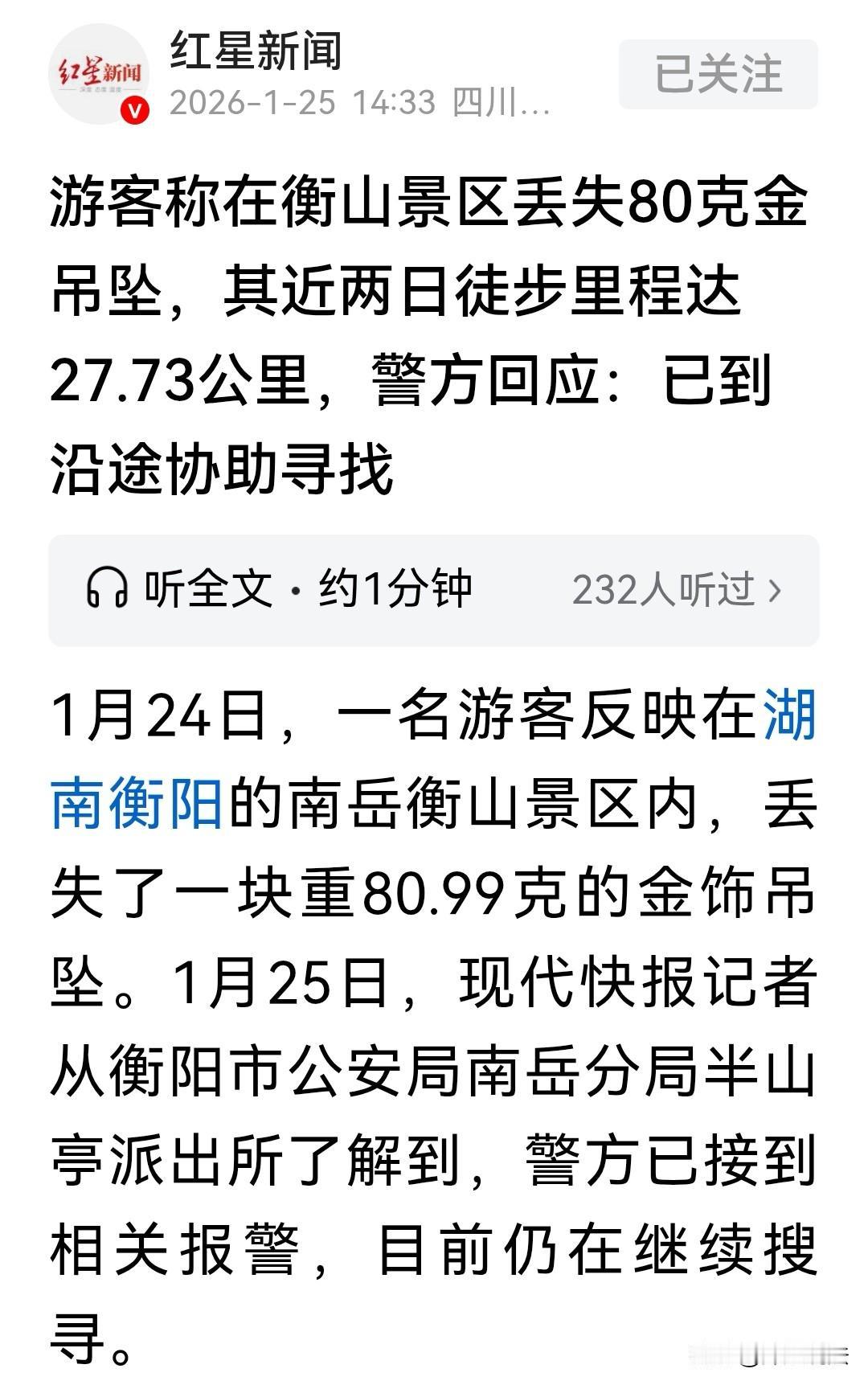湖南衡阳,男子的80.99克的金吊坠掉在了景区,这可是十多万元的东西!他十分焦急地找到工作人员,请他们帮忙调取监控查找,可他行经的路段有小路,监控无法覆盖。男子这两天也暂时没有离开,自己在山上寻找,已经走了27.73公里,还是没有找到。不过,民警已经介入,希望能竭尽全力帮男子找寻,也希望如果捡到的人能自觉归还,不然查到后会负法律责任。 据报道,男子在1月24日报警称,自己重达80.99克的金吊坠丢失了,丢失的地点是南岳衡山景区内。 大家听到后都是一片哗然,这可是一个金吊坠呀,那么重?挂在脖子上怎么会掉呢? 连吊坠都这么重,那这项链该有多粗啊!确实,看图片,连着吊坠的链子很粗的,那为什么会掉呢? 项链还在,吊坠却不翼而飞,这到底是意外还是人为?确实值得大家怀疑。 当然,也有人觉得,这就是露财的坏处,但凡这么贵重的东西,价值近10万,怎么就不能放到衣服里呢? 如果戴上项链,把吊坠放在内衣里,它即便掉了,也可能被腰间的皮带给挡在衣服内,也不至于失财。 当然,可能自己有这些东西,也想显露出来,也不用指责这位男子,这很正常,谁不喜欢珠光宝气呢?男子也不例外。 居然还有人脑洞大开,说是不是景区游客少,用这种方式增加流量、吸引客源呀? 要知道这里可不缺游客,有时候还要限流,这种说法完全站不住脚。 要知道这名游客发现吊坠丢失后特别难过,他都没有离开景区,而是打算留下来,一直寻找吊坠。 可仅凭他一人的力量,显然远远不够,他第一时间就上报了景区,让工作人员帮忙寻找。 景区也组织多人根据男子的路线逐一排查。 而男子自己在这两天内也走了27.73公里,沿着来时的路往回找。 可以想象,这个吊坠除了价值不菲之外,可能还有别样的意义吧?要不然男子怎会如此不惜代价,留在景区徒步寻找呢? 后来,景区为了帮男子尽快找到吊坠的下落,也第一时间报了警。 民警到场后,立刻调取了男子行经路段的监控。 画面当中,并没有发现有人捡到金吊坠。 民警称,男子并非所有路段走的都是有监控的区域,还有些小路监控没有覆盖,所以找回吊坠的难度大幅增加。 不过,网友们又出招了,调取监控看看吊坠是从什么时候掉下来的,再在掉下来后的这段路线重点排查不就行了吗? 连我们都能想到的办法,工作人员和民警怎会想不到?肯定早就按这个方法实施了,也早就在这些路段开始了地毯式的搜索。 有人在想,万一被人捡到了呢?万一男子是在没有监控的地方把吊坠掉了,被当时路过的人捡到了,那也找不到别人捡拾的证据呀。 这个情况是非常有可能的,但是民警也希望拾到的人赶紧把吊坠归还给男子,不然被发现后,有可能要承担法律责任。 民警再次强调,不是自己的东西,捡到了就要归还,老话所说的“捡到就是自己的”,这种说法是错误的。 《民法典》第三百一十四条:拾得遗失物,应当返还权利人。拾得人应当及时通知权利人领取,或者送交公安等有关部门。 《民法典》第三百一十六条:拾得人在遗失物送交有关部门前,有关部门在遗失物被领取前,应当妥善保管遗失物。因故意或者重大过失致使遗失物毁损、灭失的,应当承担民事责任。 所以还是提醒大家,如果真的捡到了男子的金吊坠,必须归还,而且要归还给男子本人,或者交到派出所,亦或是交到景区,还要留好交接证据。 因为这可是价值近10万元的财物,如果自己弄丢了,或者在交接的过程当中遗失了,那可是要进行赔偿的,可不要到时候适得其反。 主动交给失主,还有可能获得相应的报酬,可若是弄丢了这10万多元的东西,就得自己赔偿了。 对于此事,大家如何看待呢?素材来源于红星新闻。