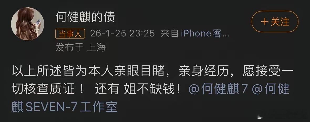 前女友回应何健麒前女友再锤何健麒吸毒d,这反击够刚!何健麒方用“短剧演员收入低”哭穷回应后,前女友“何健麒的债”火速开怼,两大核心信息直击要害!一是霸气回怼“姐不缺钱”,堵死对方“为财诬陷”的猜测;二是重申2021年同居期间“亲眼目睹”其吸毒、被海淀警方带走检测,直言警方有记录可查。双方说法完全对立,原定今日开播的《君心似疾》也蒙上不确定性。现在压力给到警方和平台,后续坐等真相大白!你站哪一方?👇前女友回应何健麒