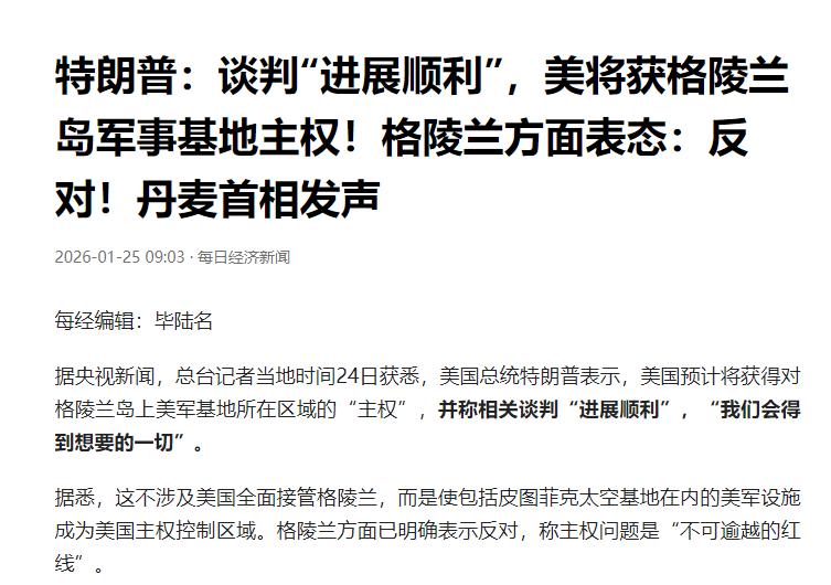 他还真敢干! 美国总统今天突然宣布: 1月25日,美国总统特朗普宣布,美国预计将获得对格陵兰岛上美军基地所在区域的“主权”,并称谈判进展顺利。简单来说,就是美国想把它在格陵兰的军事基地,比如重要的皮图菲克太空基地,变成自家的“主权飞地”,并非要一口吞下整个格陵兰。但格陵兰方面立刻怼了回来,强调主权是条“不可逾越的红线”,丹麦首相也斩钉截铁地表示,啥都能谈,就是主权没得谈。 特朗普这波操作,直接把格陵兰和丹麦都惹毛了。很多人可能没意识到这件事的离谱程度。美国不是要买下整个格陵兰岛,而是想把自己租来用、已经有驻军的基地区域,硬生生变成自家的“主权飞地”。 特朗普1月25日的表态说得很直白,美国预计会获得格陵兰岛上美军基地所在区域的“主权”,还嘴硬说谈判进展顺利。 他特意提了皮图菲克太空基地,这座基地是美国在北极地区最重要的军事支点,承担着导弹预警、太空监测和情报收集等核心职能。 皮图菲克太空基地位于格陵兰岛西北部,距离北极只有1524千米,从这里能直接监测俄罗斯北部的军事动向,是北美防空体系的关键前哨。 美国早就对这块地垂涎三尺了。特朗普2025年重返白宫后,就多次扬言要拿下格陵兰相关权益,1月22日还放话,不会花一分钱购买,却要取得对该区域的“全面准入权限”。 格陵兰方面的反应一点不拖沓,直接亮明立场,主权问题是“不可逾越的红线”,没有任何商量的余地。 丹麦外交大臣早在1月21日就撂了狠话,明确告诉特朗普,丹麦绝不会就格陵兰岛主权归属进行谈判,这是底线。 很多人疑惑,美国在格陵兰已经有大量驻军,甚至享有远超丹麦驻军的行动自由,连治外法权都拿到了,为啥非要执着于主权? 核心原因就在于北极的战略价值。随着气候变暖,北极航道的商业和军事价值急剧提升,谁掌控了格陵兰,谁就握住了北极航道的关键节点。 格陵兰岛上还藏着丰富的稀土、铜、镍等关键矿产,这些资源是高科技产业和能源转型的核心命脉,对美国制造业回归和掌控全球能源市场至关重要。 更关键的是,美国想通过控制这块区域,在北极大国竞争中压制俄罗斯。皮图菲克太空基地升级后,雷达监测范围能覆盖俄罗斯大部分领土,还部署了可携带核弹的F-35A战斗机。 特朗普的野心绝非一时兴起。他早在之前的任期内就提出过购买格陵兰,被拒绝后一直没放弃,这次索要基地主权,本质上是换了种方式推进战略目标。 这背后还有一层算计,就是向欧洲施压。美国想通过这种霸道手段,让欧洲明白谁才是“老大”,逼欧洲在安全和经济上更依赖自己。 欧洲方面看得很清楚,美国的做法是想打破原本平等的同盟关系,把美欧同盟变成由美国单方面控制的主仆关系。 欧盟已经在酝酿反制措施,不仅暂停了美欧贸易协议的审批,还准备了总额930亿欧元的贸易反制清单,甚至考虑抛售美元资产施压。 但欧洲的处境很尴尬,既不信任美国,又在安全上离不开美国。多数欧洲小国还在观望,不敢直接和美国硬刚,只有丹麦和格陵兰明确划出了红线。 特朗普政府之所以有恃无恐,底气就来自对欧洲的绝对军事优势。即便欧洲向北极派了零星军队,和美国在该地区的掌控力相比,也完全不在一个量级。 这场主权之争,本质上是美国霸权扩张与欧洲战略自主诉求的碰撞。 格陵兰和丹麦的强硬回应,守住了国家主权的底线。 而美国的霸道行径,只会进一步撕裂美欧关系,让更多国家看清其霸权本质。 后续谈判大概率会陷入僵局,特朗普口中的“进展顺利”,更像是自欺欺人的政治口号。