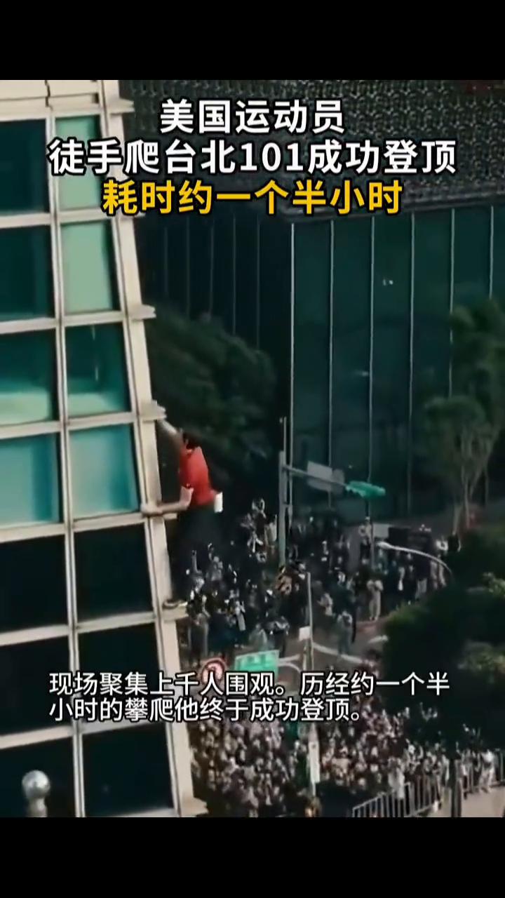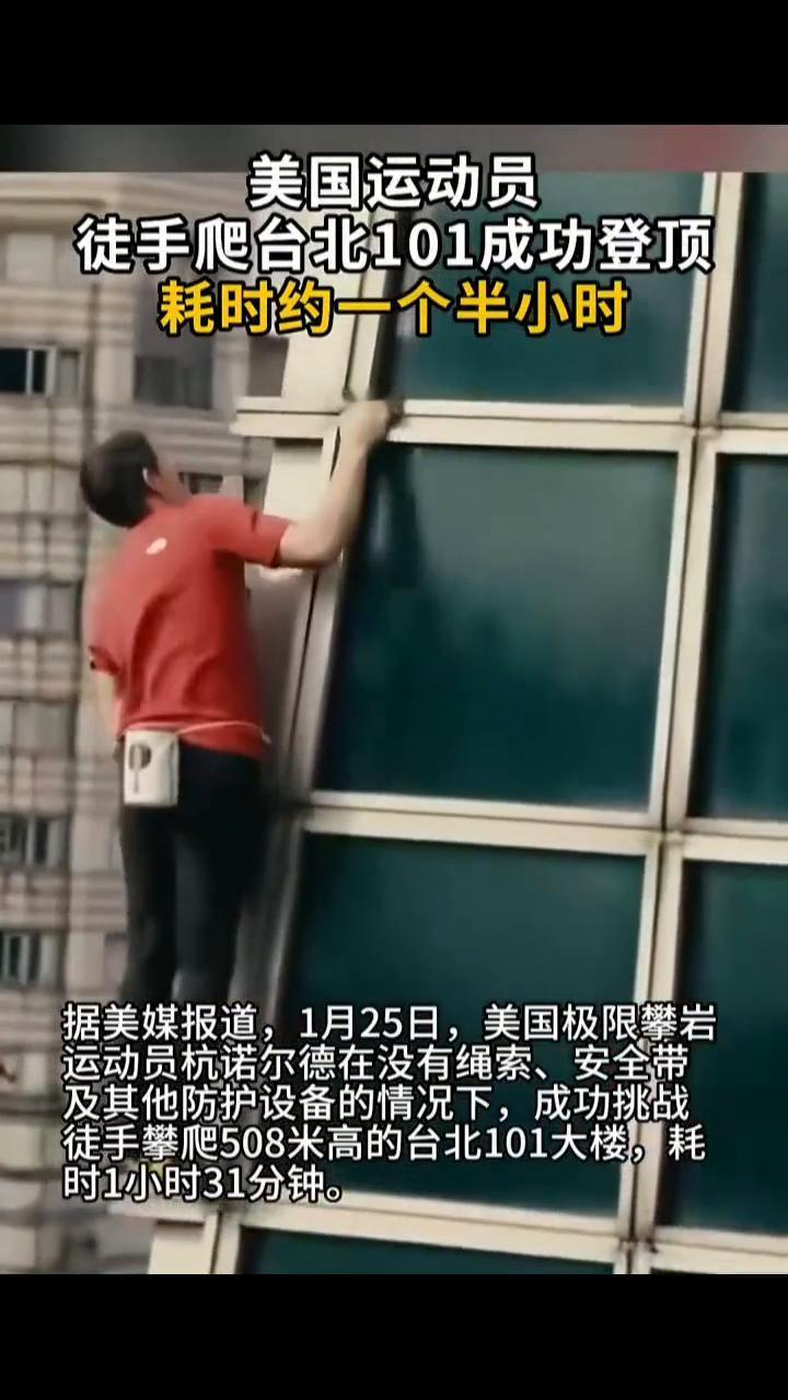 美国运动员徒手爬台北101成功登顶,耗时约一个半小时。 据美媒报道,1月25日,美国极限攀岩运动员杭诺尔德在没有绳索、安全带及其他防护设备的情况下,成功挑战徒手攀爬508米高的台北101大楼,耗时1小时31分钟。现场聚集上千人围观,历经约一个半小时的攀爬他终于成功登顶。