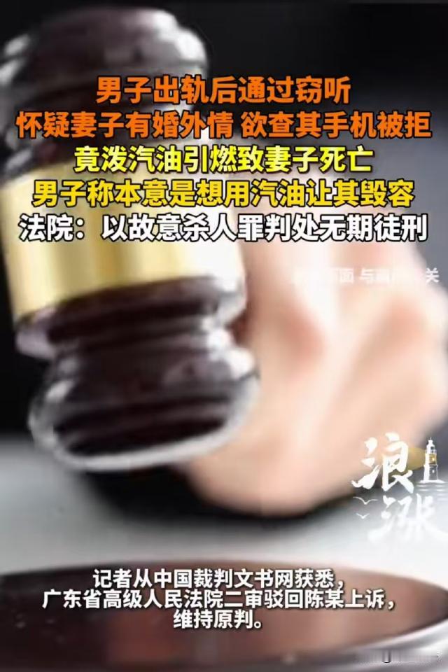 广东,男子出轨导致夫妻感情不和,后来男子怀疑妻子也有外遇,要求查看妻子的手机,妻子不肯,男子就将汽油泼到妻子身上,想毁她的容,点着火后,男子开车逃离现场,妻子被大火烧死。第二天,男子主动投案,最终被判处无期徒刑,可男子不服,认为一审对他量刑过重,并提起上诉。 据红星新闻、浪涨新闻等报道,陈某和妻子车某结婚多年,两人生育了四个子女。 按理说,陈某和车某生了这么多孩子,家庭关系应该非常稳固才是,可是陈某不知道珍惜,反而经常和一帮朋友混迹于娱乐场所。 2020年,陈某唱K时认识了一个陪酒女朱某,两人发展为了不正当的男女关系。 俗话说没有不透风的墙,妻子车某很快发现了不对劲,而女人一旦发现丈夫有情况,就会立马变身福尔摩斯,车某很快就从蛛丝马迹中发现了陈某出轨一事。 夫妻二人大吵一架,虽然碍于4个孩子没离婚,但夫妻感情却再也回不到从前。 渐渐的,车某对陈某越来越冷淡,陈某多次看到她和别人发消息。 陈某怀疑车某有外遇,他渐渐在家时间越来越多,出去玩的次数越来越少,可车某还是对他淡淡的。 陈心里极度不平衡起来,他觉得,自己已经改了,凭什么车某还这么对他? 为了确认车某是不是做了对不起他的事,陈某在他们的卧室里安装了一个窃听设备,没几天,陈某听见车某和人发暧昧语音信息。 2024年3月24日晚,陈某质问车某是否做了对不起他的事,车某不承认,陈某不信,要求她说出手机密码,让自己查看她的聊天记录。 车某不肯,陈某就想,干脆毁了车某的容,脸毁了看她还怎么和别人勾三搭四! 于是,陈某往饮料瓶里装了800毫升汽油,放在后备箱里。 当天晚上,陈某开车将车某带到一处偏僻地方,再次追问车某是不是有婚外情,车某不理他,拉开车门下了车。 陈某紧跟其后下了车,继续追问车某是不是做了对不起他的事,车某还是不理他。 陈某二话不说,从车里拿出饮料瓶,将汽油从车某头上淋了下去,威胁她老实交代。 车某气愤之下和陈某翻旧账,说明明是陈某先对不起她和孩子的,凭什么现在这样来质问她? 陈某辩解说自己已经回归家庭了,为什么车某还是揪着旧事不放?难道做错一件事就再也不能被原谅吗? 两人你一句我一句,吵得不可开交,陈某被车某激怒,竟然掏出打火机点燃还有汽油的饮料瓶扔向车某,引燃了车某身上的汽油。 车某被大火烧得发出阵阵惨叫,陈某转身开车逃离现场,车某当场离世。 第二天下午,陈某自知逃不过,于是主动投案。 根据《刑法》第二百三十二条规定,故意杀 人的,处死刑、无期徒刑或者十年以上有期徒刑;情节较轻的,处三年以上十年以下有期徒刑。 一审认为,陈某提前准备好汽油,后将汽油泼到妻子车某身上并点燃,最终导致车某被烧死,陈某构成故意杀 人罪。 但鉴于陈某主动投案,根据《刑法》第六十七条规定,犯罪以后自动投案,如实供述自己的罪行的,是自首。对于自首的犯罪分子可从轻或者减轻处罚。 最终,一审以故意杀 人罪判陈某无期徒刑。 但是,陈某不服,又提起了上诉。陈某提出: 1、车某出轨是导致本案发生的根本原因,车某在此事中存在过错,应当减轻对他的处罚。 2、自己本意是毁车某的容,并没有杀 害她的故意,因此不构成故意杀 人罪。 3、自己是和车某吵架后情绪失控,才做出伤害她的举动,自己是激情犯罪,主观恶性较小,判处自己无期徒刑量刑太重。 二审认为: 1、陈某称车某出轨,但没有任何证据,仅凭自己猜测,不能认定车某存在出轨事实,也不能认定车某对本案的发生存在过错。 2、陈某辩解称自己只想毁车某的容,但他作为一个成年人,应当知道用汽油淋他人并放火会导致他人死 亡的结果,却放任这种结果发生,陈某主观上有杀 害车某的故意,构成故意杀人 罪。 3、陈某称自己是激情犯罪,原判量刑过重。 激情犯罪是指在强烈的情绪冲动支配下,临时起意实施的犯罪行为,其特点在于情绪冲动的即时性和犯罪行为的突发性。 在司法实践中,激情犯罪通常会作为酌定量刑情节来考虑,但是,陈某并不属于激情犯罪。 陈某在实施犯罪前,准备了800毫升汽油放在车里,这一行为表明他有时间进行准备与谋划,并非是在突发的、不可控制的激情状态下立即实施犯罪。 陈某提前准备犯罪工具,经过了一定程度的思考和计划,心理上有实施犯罪的预先准备,所以,陈某的行为属于有预谋的犯罪,而非激情犯罪。 最终,广东高院认为陈某的上诉理由不成立,驳回了陈某的上诉,维持原判。