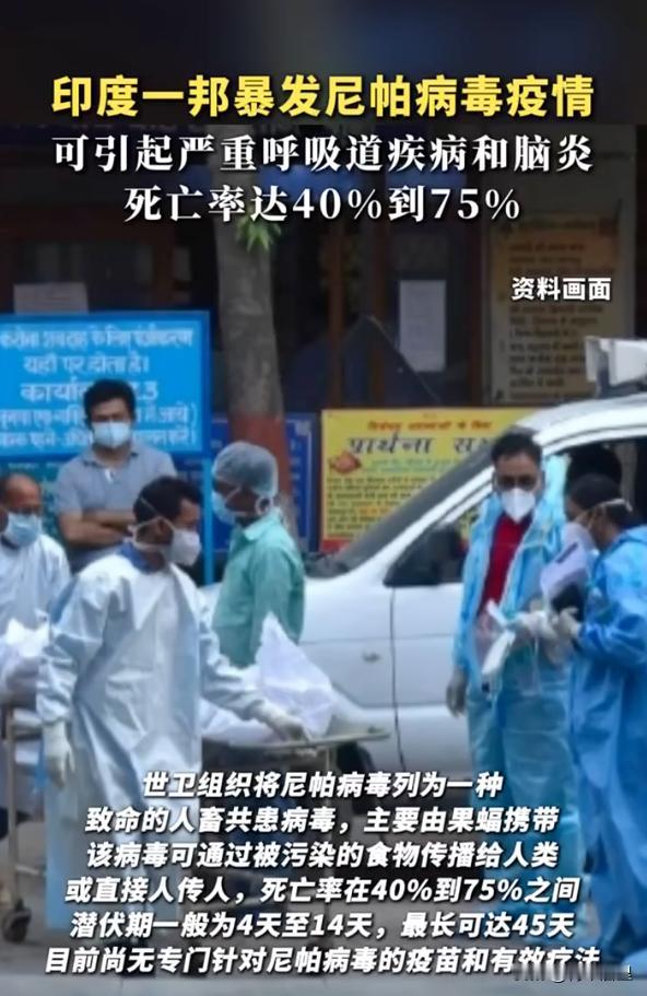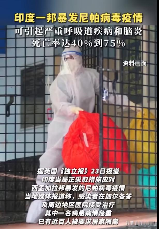 印度的西孟加拉邦爆发“尼帕病毒”,目前已经确诊5例,1人病危。 据说有医护人员也中招了,另外,有100多个密切接触者被要求居家隔离。 看网上报道,感觉这病毒挺严重的,属于是人畜共患病,可通过体液和飞沫进行人与人之间传播。 专门攻击人的肺部和脑部,死亡率能达到40%到75%。 最为关键是,目前没疫苗,没任何特效药。从感染到发病最长能潜伏45天,让人防不胜防。 冬天是病毒的高发季,现在邻国又出现这种事情,所以,出门口罩还是一定要戴好,不能松懈。 现在这种情况,感觉得考虑加强对入境人员的健康监测了,尤其是高风险地区。 万一有个疏忽,按照目前网上所说的这病毒的凶险程度,后果真的不敢想。