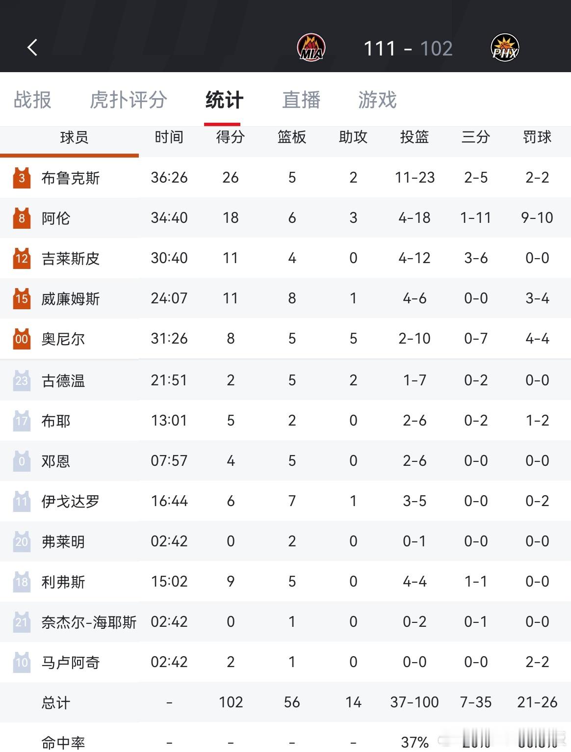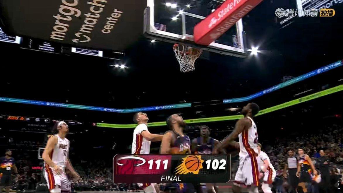 布克缺阵,太阳102-111主场不敌热火。太阳和湖人的差距目前为1个胜场热火vs太阳 热火战胜太阳