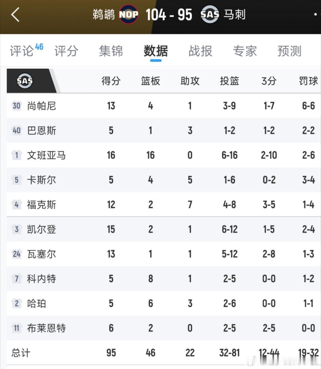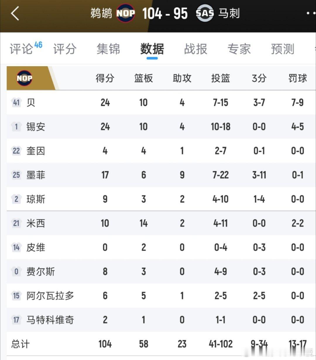 马刺主场95-104爆冷不敌鹈鹕,胜场差与掘金相同。萨迪克-贝和锡安各得24分10板4助,文班16分16板4帽鹈鹕vs马刺