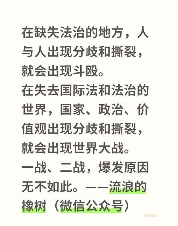 在缺失法治的地方,人与人出现分歧和撕裂,就会出现斗殴。 在缺失法治的地方,人与人出现分歧和撕裂,就会出现斗殴。 在失去国际法和法治的世界,国家、政治、价值观出现分歧和撕裂,就会出现世界大战。 一战、二战,爆发原因无不如此。——流浪的橡树(微信公众号)