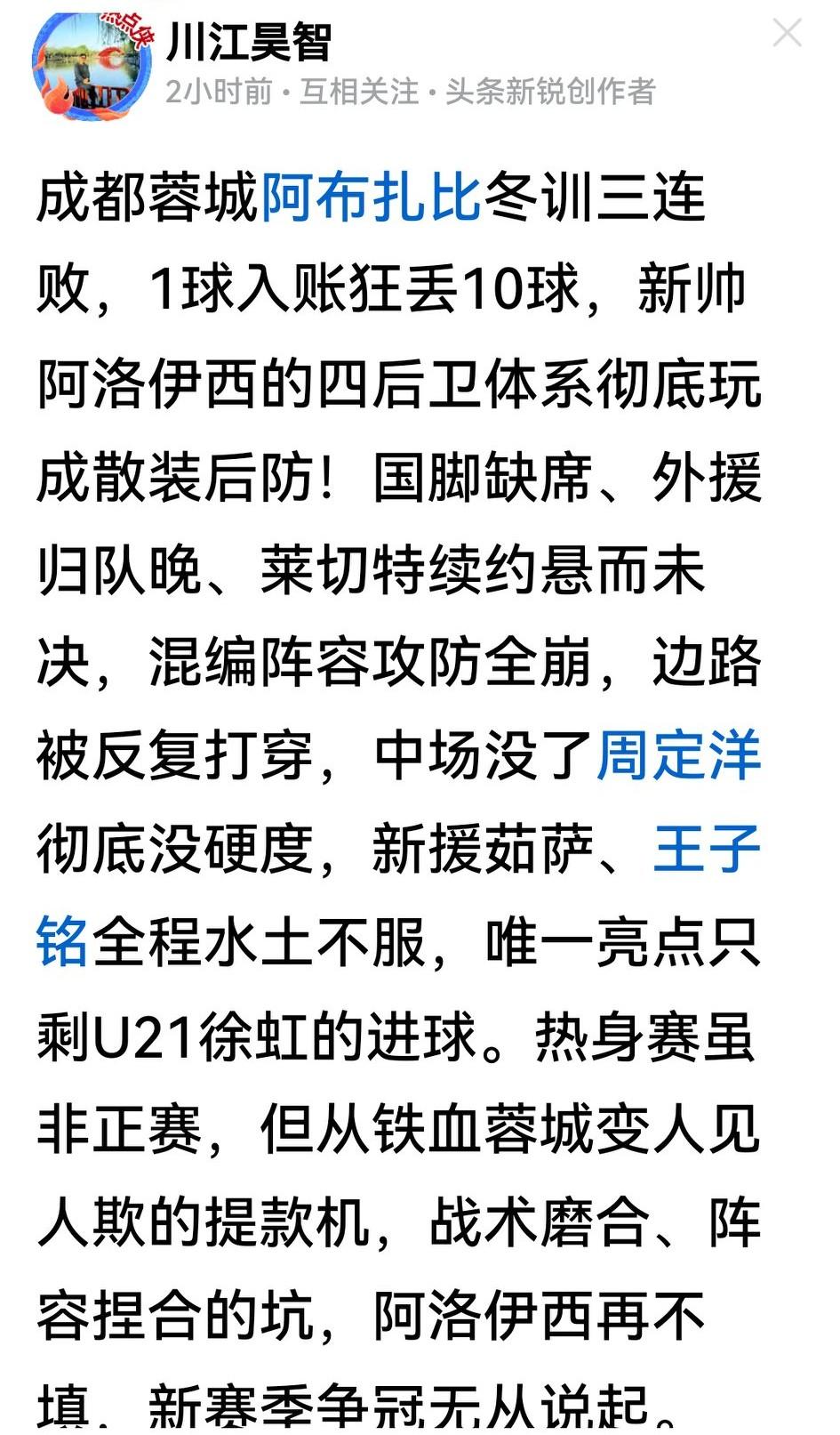 懂个铲铲,没有后防线的保障,仅靠全华班坐阵,成都蓉城新赛季就是保级的队伍,难道老板不懂足球吗?!