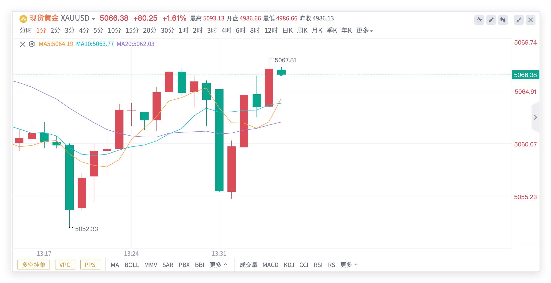 黄金第一回合5060做多,现在上涨5067附近稳一手拿下开门红离场观望,锁定70