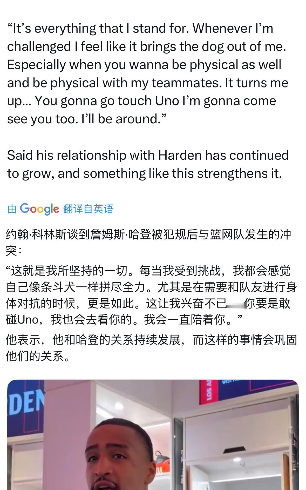 科林斯谈到保护哈登这一幕:他表示,这是他的本能反应,别人挑衅或对队友不客气,会瞬间激起他的好斗心,让他像“疯狗”一样冲上去反击。这是一种强硬的“护犊子”心态。他还表示,他与哈登的关系一直在持续发展,而像这样的事情只会让他们的关系更加牢固。