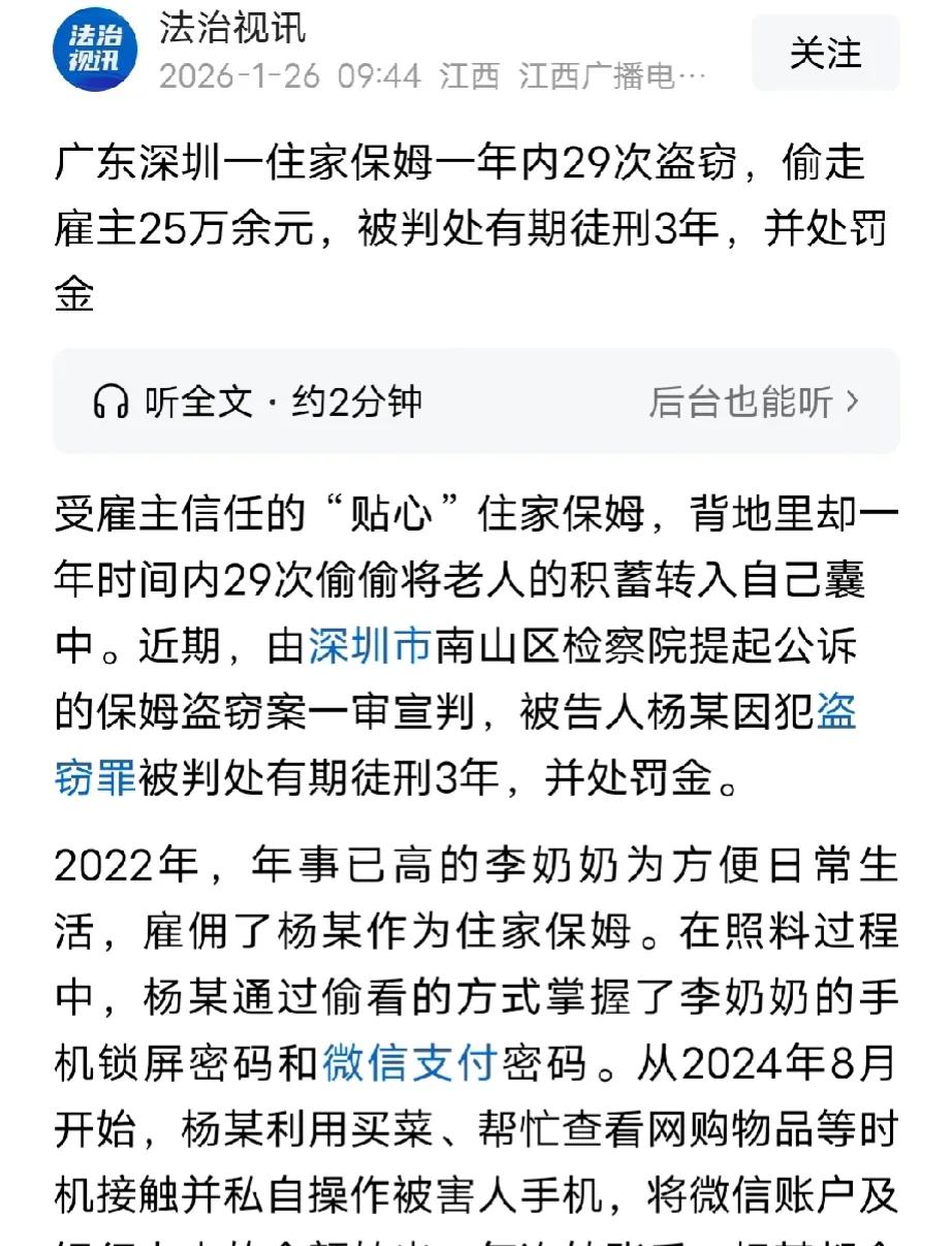 坏到骨子里了!广东深圳,一保姆在阿婆家干了3年,取得阿婆信任后,偷偷看了阿婆的手机支付密码,8个月内以各种理由骗取阿婆手机,偷偷给自己转账29次,总计25万元,每次转完账她就删除记录,直到阿婆家人发现手机余额异常,女子才暴露,最终她为此付出惨痛代价。 广东深圳的李奶奶,年事已高,孩子们都有自己的工作,没空照顾她,为了方便日常生活,李奶奶家人托人给她找保姆。 2022年,经人介绍杨某来到李奶奶家做住家保姆,平时负责照顾李奶奶的生活起居。 杨某勤快,干活也利索,深得李奶奶的喜欢和信任,所以,李奶奶给她的劳动报酬并不低,以至于,杨某在李奶奶家一干就干了3年。 按理李奶奶和家人那么信任杨某,她应该珍惜这份工作,好好对待人家,可杨某无意中的一个发现让她有了邪恶的念头。 2024年8月份的一天,李奶奶在网上购物,当时杨某就在她旁边。 李奶奶眼神不好使,动作也缓慢,她输密码的时候动作很笨拙,而且每次都再三确认,因此,让杨某有了可乘之机。 杨某紧紧盯着李奶奶输密码的手,偷偷记下了她的支付密码和手机锁屏密码。 知道了李奶奶的密码,杨某是既激动又紧张,因为她知道李奶奶有不少存款。 杨某的心里有了盘算,如果她能拿到李奶奶的手机,就可以不动声色地把钱转走,这来钱的速度可比打工快多了。 有了这个想法后,杨某开始实施她的计划,有时她以帮李奶奶查看取件码、看网购的物品或者买菜付款等为由,骗取李奶奶的手机。 手机拿到手后,她快速地给自己转账,有时转几千,有时转一两万,每次给自己转完钱,杨某就把转账记录删了,每次都做到神不知鬼不觉。 也许是李奶奶存款本就多,所以杨某的举动一直没被发现。 就这样,从2024年8月份开始,杨某一共给自己转了29笔,合计25万。 直到2025年3月,李奶奶家人在查看李奶奶微信余额时,发现了微信余额不对,通过认真查看,发现多笔转账异常,杨某的行为才暴露。 最终,李奶奶家人报警处理,2025年8月8日,检察机关依法向法院提起公诉。 最终,杨某因犯盗窃罪被判处有期徒刑3年,并处罚金。 杨真的是坏到骨子里了!李奶奶一家人待她不薄,给她高工资,还让她住家里,三年的信任说辜负就辜负。 就因为看到老人眼神不好输密码慢,居然偷偷记下来,转头就找各种借口骗手机转账,转完还删记录,29笔啊,整整25万! 这哪是保姆,分明就是披着羊皮的狼!要不是家人发现余额不对劲,这老人的养老钱怕是要被她榨干。 最后判三年真的是便宜她了,这种利用别人信任谋财的人,就该让她付出更惨痛的代价,长长记性! 对此,大家怎么看?
