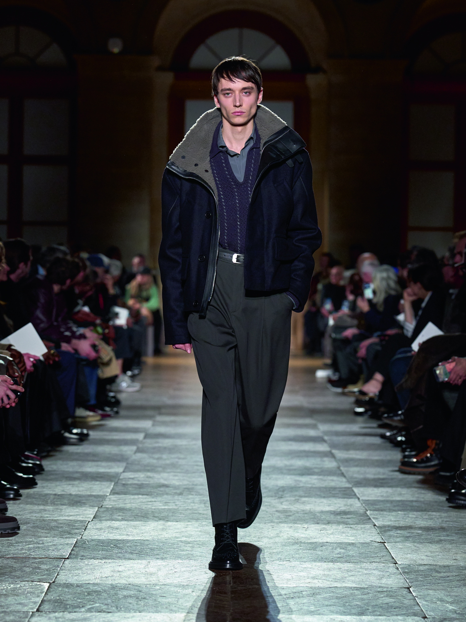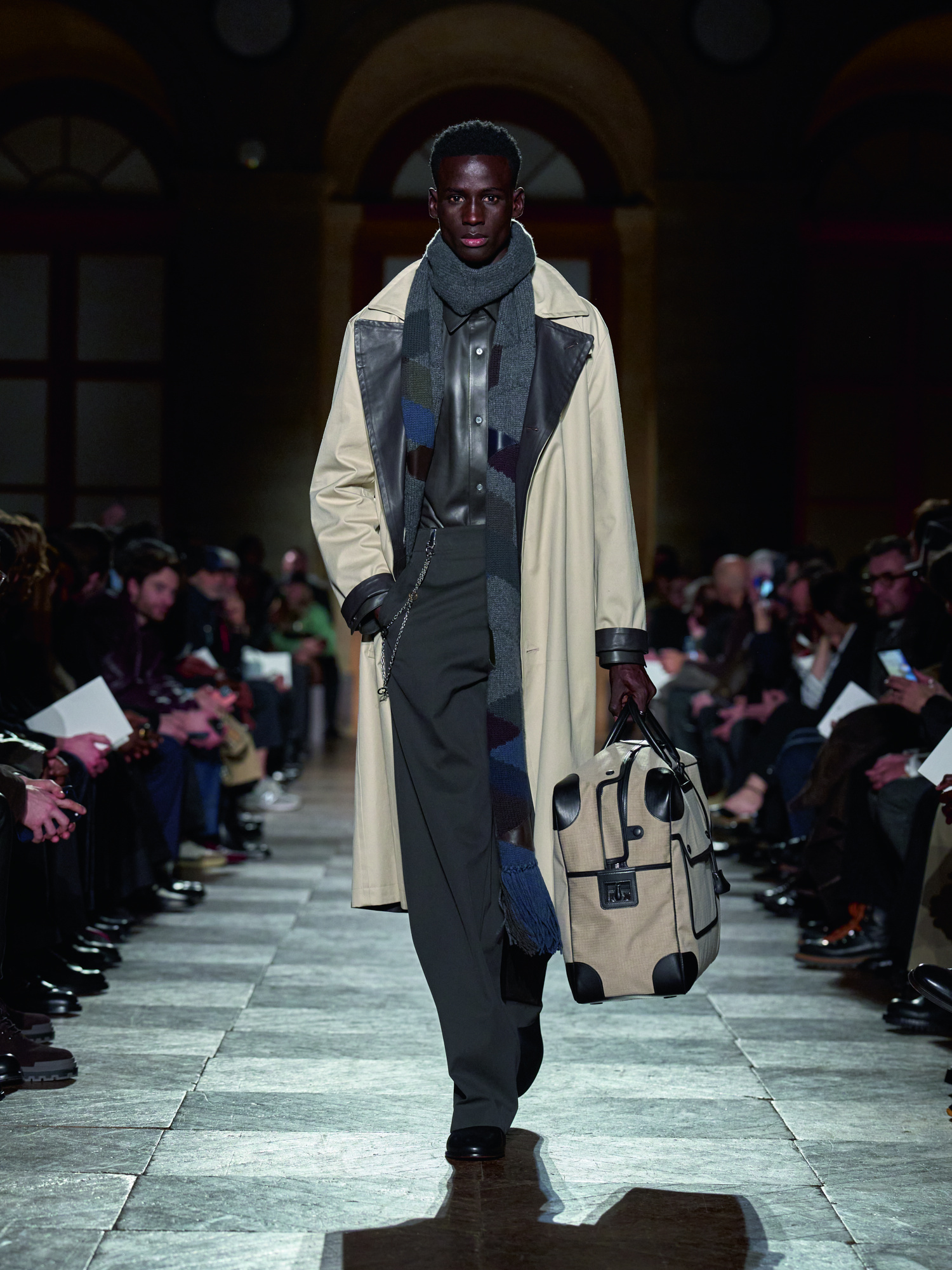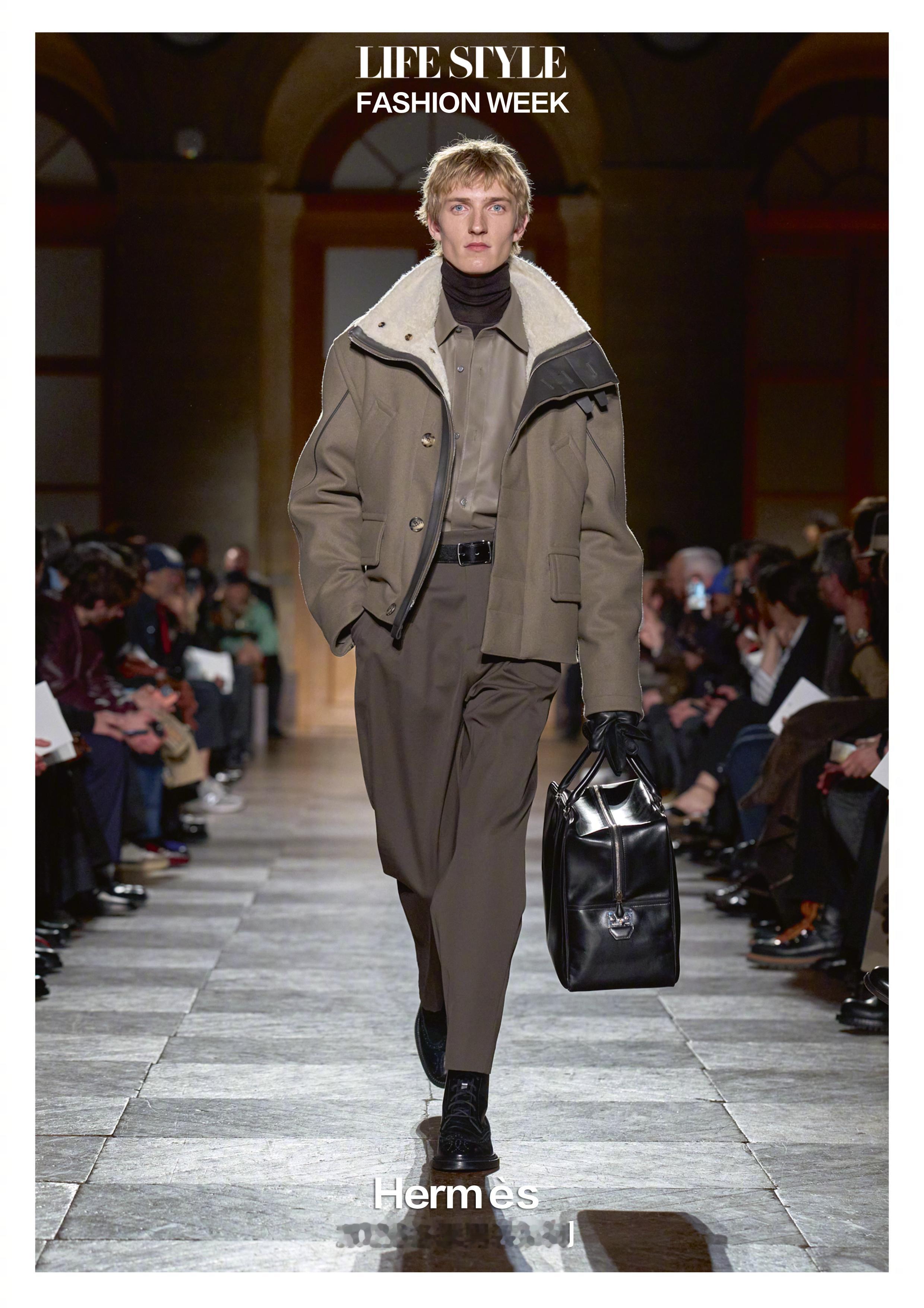 爱马仕正式发布2026冬季男装系列。系列以“流动人生中的恒久陪伴”为理念,融合传统工艺与现代科技。关键单品包括采用Toilovent科技里衬的羊羔毛外套、双面羊绒羊毛旅行大衣等。色彩以墨蓝、绛紫等深色为主,用橙色内衬点缀。标志性的马镫缝线等细节,延续了品牌的工艺叙事。爱马仕2026冬季男装