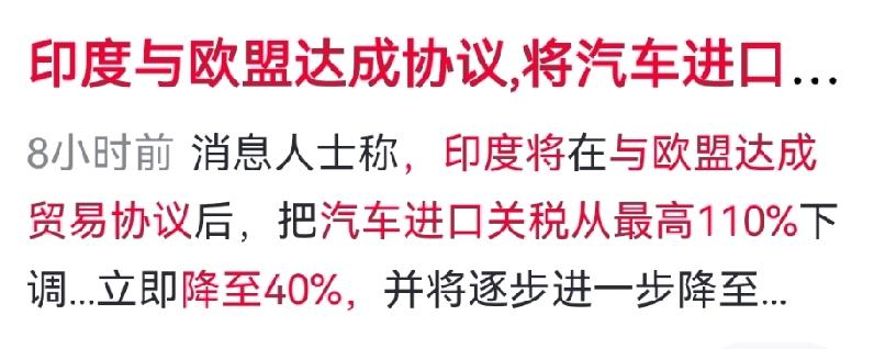 印度与欧盟闪电达成贸易协议,汽车进口关税从最高110%直降至40%,未来还将降到10%。但这并非单纯的开放——印度设下精妙限制:仅对1.5万欧元以上的豪华燃油车降税,本土入门市场毫发无伤;设置20万辆年度进口红线;纯电动车被排除在外,为本土新能源企业争取五年窗口。 这实则是印度以市场换技术的“精准对局”。欧盟急于分散供应链、降低对华依赖,印度14亿人口市场成为诱人选项。双方各取所需:欧洲车企获得新增长空间,印度则借势引入技术、升级产业链。 然而协议背后矛盾未解,农业、乳制品等敏感领域均未触及,地缘战略上也难同步。一次关税跳水,撬动的不只是印度市场,更是全球汽车业格局的重新洗牌。 对此你怎么看?