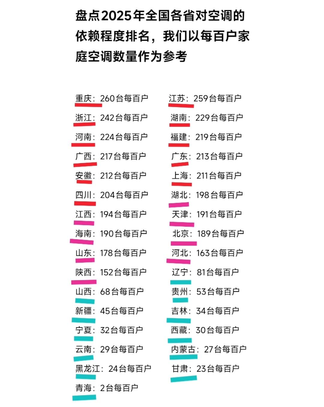 这样看来夏天的重庆、江苏、浙江是比较炎热的,以至于人均空调数量比广东、广西、海南还多。因此我觉得从气候状况来看江苏与浙江距离宜居地区还是相差甚远,夏季经常能达到35度以上,冬季很多城市还没有暖气。这种时而汗蒸,时而湿冷的感觉,对于很多北方人来说还是难以适应。 相比之下云南、贵州、大连、烟台、威海这一带应该算是我国最宜居的地区。夏天不热,冬天也不算太冷,仔细想想这样的地方才是最令人向往的。