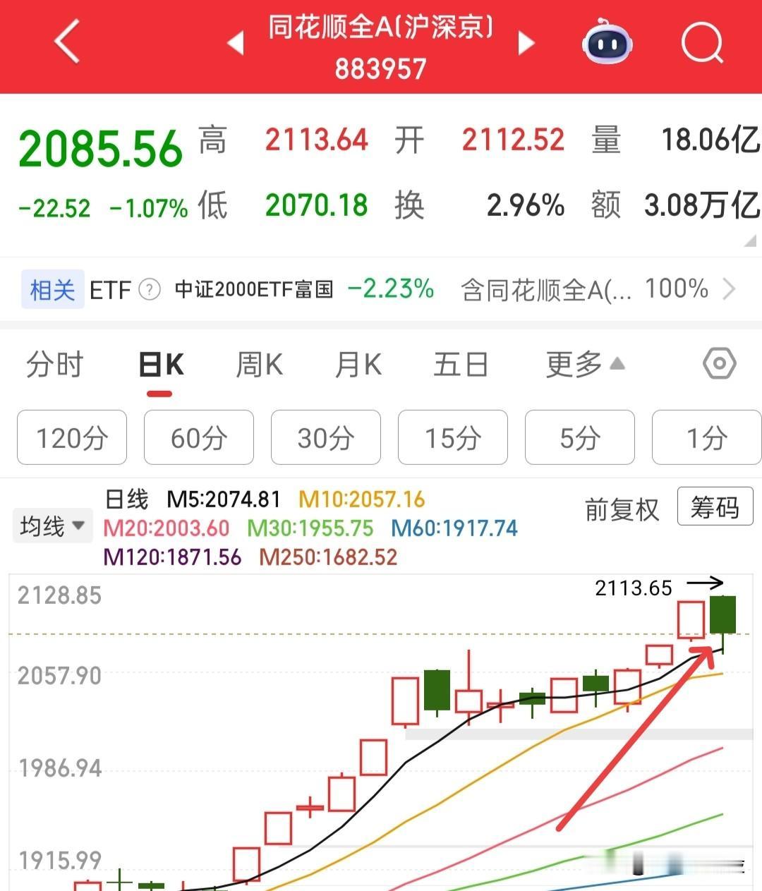 大阴线要清仓跑路吗?是不是要开始回调了?有人很怕,问我怕不怕,怕我绝对是不怕滴,这种日线也不应该害怕!!! 你看全A这里,今天大概率收一根光头下影线,是不是咱们周末刚说过?有印象吧?主升浪会有巨大分歧,只要是光头下影线阴线或者十字星阴线,都不看空,除非跌破了5日线那才需要小心呢! 目前全A走出这么一根阴线,就是周末出的消息,特意去打压情绪,然后又怕大家跑路,专门维稳大盘来抚平大家的恐慌心理! 所以收盘大盘应该就是一根假阴线,应该是红盘收尾,这样大盘明天再涨一天就该选择方向了,因为快形成M顶的右侧高点了! 那么思路就清晰了! 受情绪压制以及消息面的错杀,明天全A大概率又会高开,修复过后回落下来,那么明天冲高大概率就很多资金要跑路!那么推测一下,明天开盘过后大概就会有3000多家上涨,但是收盘就不知道了! 明天大盘再涨,就有双头的预期,所以呢明天是不是应该先出局观望呢??