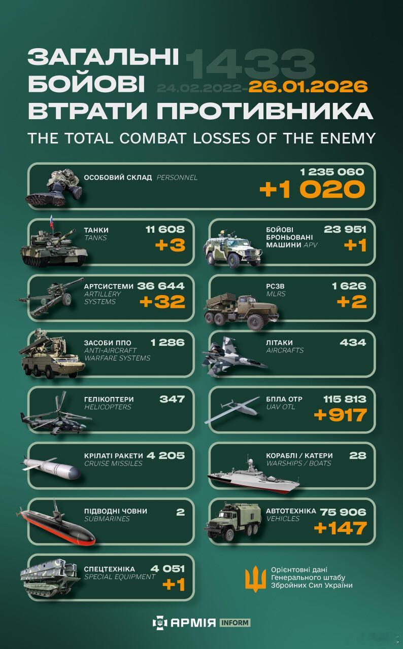俄乌冲突 “世界第二军”俄罗斯只示范一次现代战争速度1小时22分又1433天乌克兰武装部队24小时又538天被驱逐出库尔斯克截至2026年1月26日“超级大国”俄罗斯损失战报约1235060头11608辆坦克23951辆装甲车36644门火炮1626门多管火箭炮1286套防空系统434架飞机 347架直升机115813架无人机4205枚导弹28艘军舰2艘潜艇75906辆汽车4051套特殊装备