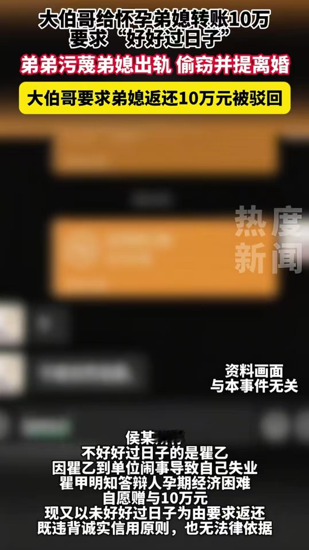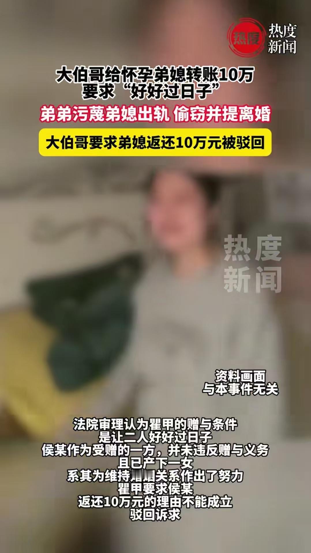 陕西铜川,弟弟和媳妇闹离婚,男子给弟媳10万块钱,劝她和弟弟好好过日子,但他不知道的是,弟媳一直很老实,是他弟弟性 虐待弟媳,还反咬一口说弟媳出轨。男子转完钱,弟弟就起诉弟媳离婚,弟媳一个人生下了孩子。男子不想自己的10万块打水漂,也起诉弟媳要求她还钱,最终判决让人意外。 据热度新闻、裁判文书网等报道,瞿某和候某是夫妻关系,两人刚结婚没多久。 这个瞿某看似人模狗样,背地里却有一些不为人知的特殊癖好。 原来,瞿某是家里的老小,从小爹妈宠着长大,养的得他性格焦躁跋扈,从小到大经常惹祸。 长大后,瞿某经常浏览不雅视频,从中学了很多对付女人的招数,和候某结婚后,瞿某就把自己学的手段全部用在了媳妇身上。 每到晚上,瞿某就要求候某听他吩咐,看着候某被虐,瞿某心里就会生出一种别样的感觉。 候某刚结婚脸皮薄,即便不堪忍受,也只得咬牙坚持。 过了一段时间,候某怀孕了。候某以为自己有了身子,瞿某肯定会放自己一马,谁知瞿某的想法不能用正常人的思维来看待,他不仅不收敛,反而更兴奋了。 候某天天被瞿某逼着做一些正常人接受不了的事,再也忍不住心里的不满,和瞿某吵起了架。 2025年过完春节,候某和瞿某的关系变得非常差,候某说瞿某不正常,瞿某嫌弃候某思想保守,不如其他女人有滋味,两人闹起了分居。 4月份,瞿某、候某二人再次爆发了激烈的争吵,两人还闹得报了警。 最后,候某担心肚子里的孩子有事,收拾了一些东西离家出走了。 瞿某的家人和亲戚都以为是候某故意找事,候某有口难言,夫妻间的这档子事怎么好意思说出口?直到后来瞿某的大哥出面。 原来,瞿某的大哥多年前就开始给瞿某擦屁股,眼看弟媳离家出走,他再不出面,弟弟的家就保不住了。 于是,4月16日,大伯哥给候某转了10万块钱,告诉候某好好养胎,好好和弟弟过日子。 大伯哥还劝候某,两个人走到一起不容易,况且孩子都好几个月了,总不能让他一出生就没爸爸。 候某想想,瞿某这人嘴甜,很会给人提供情绪价值,除了那个癖好自己不能接受,好像也没有太大的毛病。 于是,候某收下了大伯哥给她的钱,一边准备待产需要的东西,一边想和瞿某再谈谈。 谁知,瞿某却嫌候某不懂情趣,下定决心和候某离婚,5月份他起诉了候某要求离婚,并且,担心自己干的事被宣扬出去,瞿某还决定先发制人。 瞿某倒打一耙,说候某和他结婚后出轨,还偷家里的东西。 候某原本还打算在给瞿某一个机会,最不济两人好说好散,没想到瞿某竟然大肆造候某的谣,还跑到候某上班的地方闹事,导致她丢了工作。 候某忍不了了,将瞿某干的好事全部抖落了出来。 瞿某丢了面子,竟然将候某的个人物品从婚房里扔了出去,换掉了门锁,还将新房挂出去准备卖房。 10月份,候某自行生下了孩子。 大伯哥见瞿某和弟媳闹到这种地步,知道他们的婚姻无法挽回了,但如此一来,自己转给候某的10万块钱不就打了水漂了吗? 大伯哥觉得,两人不离婚,候某就还是自己家的人,现在两人都离婚了,钱当然不能白白给了外人。 于是,大伯哥起诉了候某,要求她退回这10万元。 那么,这10万元侯某是否应该退回? 赠与合同是赠与人将自己的财产无偿给予受赠人,受赠人表示接受赠与的合同。 大伯哥给候某转10万元并让其好好养胎、与瞿某好好过日子,可认定为附条件的赠与行为,所附条件即候某和瞿某好好过日子。 根据《民法典》规定,受赠人不履行赠与合同约定的义务,赠与人可以撤销赠与。 大伯哥认为,候某和弟弟离婚,就有义务履行合同约定的义务,即好好和弟弟过日子,现在两人离婚,就是候某未履行合同约定的义务。 但是,一审认为候某并未违反赠与义务。 候某收下钱后,一边准备待产物品,一边打算和瞿某再谈谈,这表明她为维持婚姻关系付出了努力。 虽然最终婚姻未能挽回,但原因在于瞿某主动起诉离婚、造谣候某、扔其物品、换门锁卖房等一系列行为,并非候某不愿好好过日子。 此外,侯某产下一女,这也是她为维持婚姻关系做出努力的体现。 候某在婚姻中处于被动局面,瞿某的不当行为导致婚姻破裂,候某并无过错。 候某辩称,离婚并不是因为自己,而是瞿某提出离婚,还闹事导致自己失业,自己孕期经济困难,大伯哥自愿赠予自己10万,是在此情况下进行的。 从公平和诚实信用原则出发,大伯哥在赠与后又要求返还,既违背了自己当初赠与的初衷,也不符合诚实信用原则。 最终,一审支持了候某的主张,驳回了大伯哥的诉讼请求。