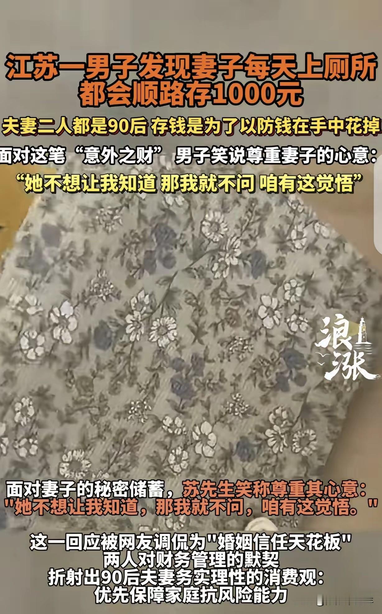 “意外之财!”江苏宿迁,一90后女子,家里明明有卫生间不用,每晚都借口出去上厕所,还偷偷带走1000元,一天,丈夫打扫房间时,竟翻出2本记事本,他打开后,里面的东西,让他眼睛都直了,竟然是200张千元存单,一共20万。丈夫恍然大悟:她不想让我知道,那我就不问,咱有这觉悟。 这事儿说起来挺逗。苏先生那天收拾屋子,本来就是想擦擦灰,一翻床底翻出俩旧本子。打开一看,全是银行存单,一张一千,整整齐齐码了两百张,算下来正好二十万。他当时就懵了,反应过来才想起媳妇这半年来的古怪行为。 俩人开个五金店,每天卖货的现金都堆在抽屉里。苏先生平时大手大脚,今天请哥们撸串,明天给店里补货,钱没少往外花。他媳妇呢,每天晚上都说要去小区公共厕所,出门前总揣走一千块现金。他当时还纳闷,家里有厕所为啥非要往外跑,现在总算明白,哪是上厕所,是跑隔壁银行存钱去了。 小区里的人知道了,有人夸这媳妇太会过日子,也有人嘀咕“夫妻之间藏钱,是不是不信任啊?”。我前几天去他们店里买东西,还看见苏女士趁她老公搬货,把一沓钱塞进布包里,当时以为她要去进货,原来都是去存定期了。 后来才知道,小两口刚开店那年亏过一次,连房租都交不起,冬天冷得要死,俩人就靠泡面熬了半个月。从那以后,苏女士就怕手里留太多现金,总觉得存进银行才踏实。苏先生其实早发现媳妇每天揣钱出门,就是看她每次回来都乐呵呵的,就没戳破。他说:“她不说,我就不问,反正都是为了这个家。” 现在网上吵翻了,有人说夫妻钱就得放一起,藏钱就是有二心;也有人说留点“小金库”挺好,万一有急事能拿出来应急。前阵子还刷到个新闻,小情侣因为查对方消费记录闹分手,对比之下,苏先生这“揣着明白装糊涂”的劲儿,反而成了婚姻里的智慧。 说白了,这二十万哪是什么意外之财,是媳妇攒了半年的底气,也是丈夫装傻装出来的温柔。换作是你,要是发现对象偷偷攒了二十万,你是直接问,还是假装不知道?评论区聊聊。