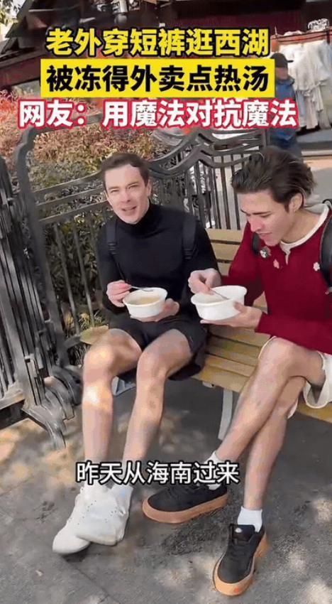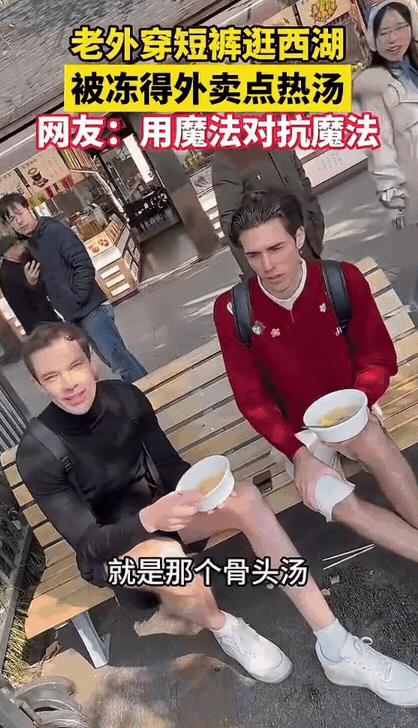 笑不活了!杭州,男子在西湖边看到了两个外国人穿着短裤!顿时感慨“老外是真抗冻啊!零下的天穿短裤。”没想到过了一会,老外接到了外卖电话。 男子还以为这俩老外下单了棉服,没想到他俩点的竟然是骨头汤!老外表示:“昨天在海南,想着杭州也是南方,没想到会这么冷啊!真是冻的我骨头缝冷,吃啥补点啥” 最近杭州的冷,相信本地人都深有体会,尤其是西湖边,寒风一吹刺骨得很,连裹着厚羽绒服的本地人都忍不住缩脖子。可就在这零下的天气里,西湖边却出现了一幕让人哭笑不得的场景,直接刷新了路人的认知。 事发就在近期,杭州正处于“速冻”模式,主城区最低气温降到了-2.4℃,西湖近岸的水域都结起了薄冰,寒意渗透力十足, 不少市民出门都裹得严严实实,羽绒服、厚围巾、棉鞋全副武装,生怕冻着自己。就在这样的天气里,一名男子在西湖边散步时,远远就看到了两个显眼的身影。 那是两个外国人,身形高大,却穿着单薄的上衣,下身竟然直接套着短裤,光溜溜的小腿暴露在寒风里,手里没戴手套,头上也没戴帽子,就那样慢悠悠地沿着西湖边闲逛,偶尔还停下来对着结冰的湖面看两眼,一副悠然自得的样子。 男子看得目瞪口呆,忍不住在心里感慨,老外是真的抗冻,这零下好几度的天,自己裹着厚棉袄都觉得冷, 这俩老外竟然敢穿短裤出门,难道他们的体质真的和普通人不一样,不怕冷吗?他忍不住放慢脚步,远远地跟着看,想看看这俩老外到底能抗冻多久。 俩老外逛了没一会儿,脚步就慢了下来,不再像一开始那样悠然,偶尔会搓一搓手、跺一跺脚,脸色也比刚才苍白了一些,眼神里也多了几分难掩的寒意,只是碍于面子,还是硬撑着,没有表现出太狼狈的样子。 没过多久,其中一个老外的手机响了,他接起电话后,嘴里说着不太流利的中文,语气里满是急切,挂了电话后,俩老外就站在原地,时不时朝着外卖小哥来的方向张望,看得出来,他们是在等外卖。 男子看到这一幕,心里顿时有了猜测,心想这俩老外肯定是冻得扛不住了,估计是在网上点了棉服或者厚裤子,想着赶紧穿上取暖,毕竟这么冷的天,再抗冻也架不住寒风一直吹,更何况西湖边的风比市区更大,寒意更重。 他越想越觉得合理,甚至忍不住在心里笑,看来不管是老外还是本地人,在杭州的冬天里,终究还是扛不住严寒。可接下来发生的一幕,却让他彻底愣住了,完全超出了他的预料,连他都忍不住笑出了声。 外卖小哥很快就骑着车赶了过来,手里拎着两个保温餐盒,并没有什么棉服或者厚衣物。俩老外看到外卖,眼睛都亮了,连忙迎上去接过餐盒,迫不及待地打开,一股浓郁的香味瞬间飘了出来——里面装的竟然是热气腾腾的骨头汤,还冒着阵阵白烟。 俩老外也顾不上讲究,找了个避风的角落,捧着保温餐盒就喝了起来,一口汤下肚,两人都忍不住眯起了眼睛,脸上露出了满足的神情,刚才的寒意仿佛都被这一碗热汤驱散了不少。男子这才明白,自己刚才完全想错了,这俩老外根本没点棉服,而是点了骨头汤来取暖。 后来通过两人的交谈,男子才知道了真相。原来这两个老外昨天还在海南,在那里习惯了温暖的天气,以为杭州和海南一样,都是南方,气温应该不会太低, 所以出发的时候,就只带了单薄的衣物,甚至还穿了短裤。可到了杭州之后,他们才彻底傻眼了,没想到杭州的冬天竟然这么冷,零下的气温加上刺骨的寒风,冻得他们骨头缝都疼。 他们也想过买件厚衣服,可一时之间找不到合适的地方,又冻得实在扛不住,就想起了中国人常说的“吃啥补点啥”,觉得骨头冻疼了,就喝点骨头汤补一补,既能暖身子,又能缓解寒意,于是就赶紧点了两份骨头汤外卖。 这段西湖边的小插曲,被路过的人拍了下来传到网上,引来了不少人的调侃,大家都觉得这俩老外又可爱又可怜。对此,你们有什么看法,欢迎评论留言~