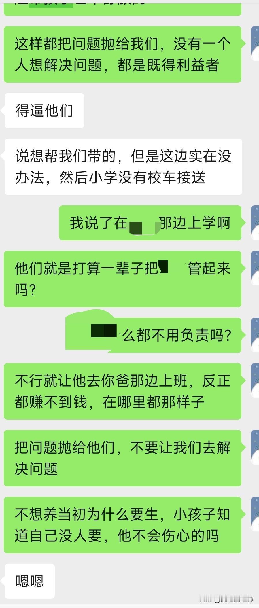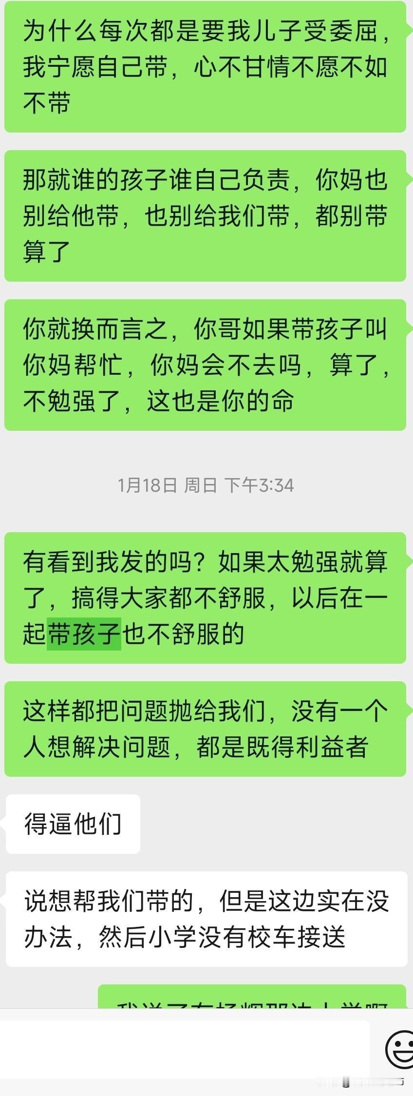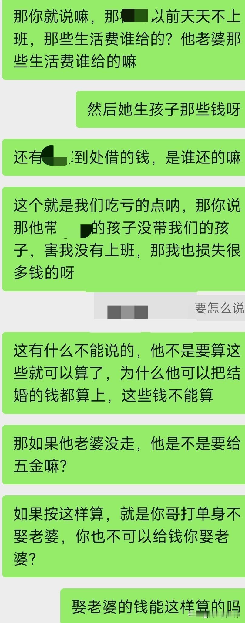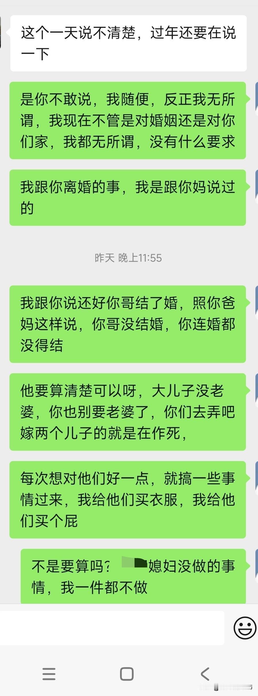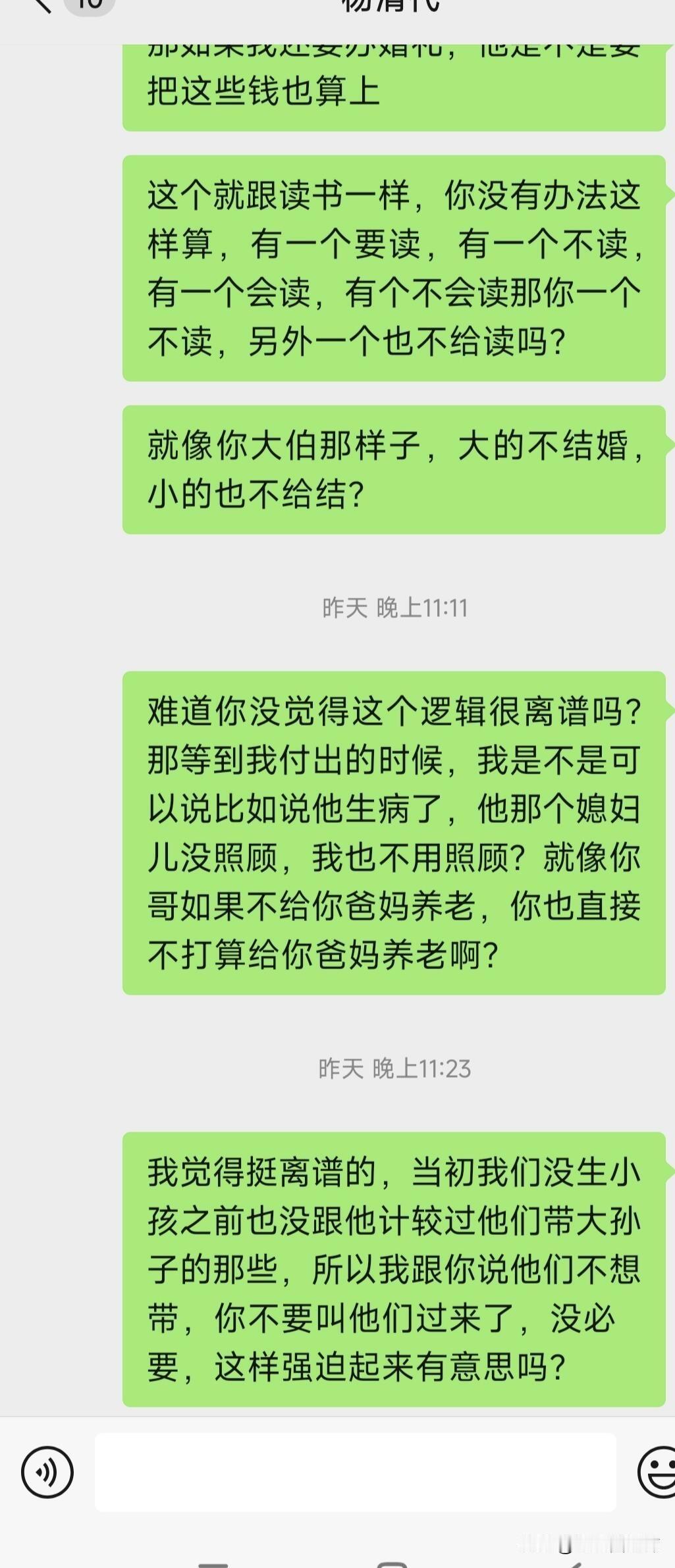 想离婚,怎么办? 我先说一下情况,我老公家是两个儿子,他是小儿子,然后两个儿子同一年定的亲,他大哥第一年就生了小孩,然后老婆满月就走了(所以就没有给五金那些),他大哥自己后面也玩失踪了,就直接和父母断联(具体情况不详),孩子就是他父母直接负责,直到近一两年才回来,小孩读大班了,然后目前为止就给了他爸妈几千块抚养费。中间我们也给孩子压岁钱,给他每年买衣服,买玩具。 然后我们是23年有的小孩,当时做完月子也差点离婚,月子里他妈妈没怎么照顾我。基本都是我一个人在房间带小孩。我们是只打算生一个,不想孩子做留守儿童。还是想让婆婆过去我们工作的地方帮忙带小孩,而且当时他妈妈对我孩子并不好,我孩子才几天的时候,他只顾大的,不管小的。就是当着我们俩的面的情况下,所以也觉得很偏心,不敢放过去。他们不愿意,然后我出了月子回娘家,我婆婆就直接出门去外地了,直到我小孩一周岁才开始有联系,中间都没有问过一次。后面我想着小孩还是要有爷爷奶奶的,就让步了。关系开始缓和。 然后今年我老公实在压力大,就想让他妈妈明年过来带小孩。但是他妈妈还是不愿意,他就去跟他妈妈跟他哥哥谈。想让他哥哥把孩子接手起来,让他妈妈帮我们带几年孩子。然后他爸妈就开始跟他算账,意思说我们结婚花了多少钱,然后他给他哥带孩子花了多少钱?然后为了公平如果我们结婚多花了的要抵掉,我真有点气笑了! 我是觉得挺不可理喻的,那他嫂子走了,没有五金,没办婚礼,那意思我也不可以有?他们以前带孩子那么多年,我们都没说什么。现在我们想要他们帮忙,就开始跟我们算这个。他哥哥小孩都不管,难道会管他们养老,以后养老还不是要靠我们?那既然要算的话,就算一下以前他帮了他哥多少忙?既然他想要对大儿子绝对的公平,要么两个都别带了有毛病吗? 本来我老公就比较老实,然后我一个人带娃就会有点崩溃,就经常情绪爆发,想离婚。也跟我婆婆讲过。但是他们现在还这样子,我就觉得这个日子真的没必要过。 P6P7是之前的聊天记录,劝过我老公放弃,他觉得是自己的父母,然后他多次表达自己压力比较大,逼一逼父母总会过来给他带的 真诚想问一下,这个是我的问题吗?