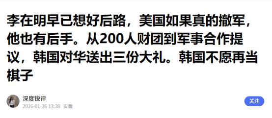 李在明已经想好后路,美国如果真要撤军,他会让特朗普为此后悔? 当五角大楼 1 月 23 日扔出《2026 年国防战略》时,韩国政坛表面一片沉默,实则暗流汹涌,在野党领袖李在明当天就悄悄下令团队彻查美军撤军可能引发的防务漏洞,转头又通过非正式渠道向中国释放合作信号。 这波操作明眼人一看就懂:这位政坛老手早为美国 “跑路” 备好了后路,就等特朗普真敢动撤军的念头,让他尝尝什么叫 “搬起石头砸自己的脚”。 先说说特朗普这步 “甩包袱” 的操作有多鸡贼。五角大楼那份 25 页的报告里,最扎眼的就是那句 “韩国有能力承担威慑朝鲜的主要责任”,说白了就是 “以后半岛的事儿你自己扛,美国只搭把手”。 目前驻韩美军有 2.85 万人,韩国媒体掐指一算,按照这思路,美军至少得撤走一半,最多可能溜掉 2 万人,最后只留万把人撑场面。 特朗普为啥突然想撤?还不是自家日子不好过了:一边要集中精力 “一统西半球”,跟伊朗、古巴这些国家较劲。 一边在高超音速导弹领域连中俄朝都比不上,甚至被美媒扒出 “不如伊朗”,手里没硬家伙,自然不敢在半岛跟中朝耗着。更别提驻韩美军的开销像个无底洞,特朗普早就逼着韩国加钱,如今干脆想直接 “断供” 走人。 可特朗普千算万算,漏了李在明这号 “硬茬”。这位在韩国政坛摸爬滚打多年的人物,早就看透了美国的 “利己本性”。就在五角大楼报告发布当天,李在明没跟韩国政府一起装 “淡定”,反而立刻下令团队梳理三大问题:驻韩美军撤走后,韩国 45 万常备军能不能顶住朝鲜压力? 战时指挥权还没完全拿到手,真出事了谁来拍板?更关键的是,一旦美军减量,韩国的国防预算得再加多少才能填窟窿。要知道韩国 2026 年国防预算已经涨了 7.5%,再往上加,老百姓的怨气不得炸锅? 李在明这手 “提前算账”,就是等着哪天尹锡悦政府扛不住了,他好拿着数据站出来问责,收割民意。 更绝的是李在明的 “对外后手”,直接把目光投向了中国。搜索到的消息显示,他已经通过经贸渠道向中方递话,希望中国能在半岛问题上多 “斡旋”。这步棋走得太妙:中国在半岛问题上的话语权摆着那儿,只要能争取到中方支持,哪怕美军真撤了,韩国也能借中国的影响力稳住局势。 而且李在明心里门儿清,特朗普最在意 “美国的面子”,要是自己真能拉着中国把半岛局势稳住,等于当众打了特朗普的脸,你看,你走了我们反而更好,你那套 “美国保护盟友” 的鬼话谁还信? 更让特朗普头疼的是,李在明还攥着 “舆论杀器”。美军要是真撤,朝鲜那边肯定不会闲着。就在 1 月 16 日,朝鲜国防省还放话,指责美军 “炒作威胁、扩大军备”,要是美军减量,平壤大概率会搞点动作秀肌肉。 到时候尹锡悦政府要是应对失措,李在明就能立刻站出来造势:“都是特朗普瞎撤军搞的鬼,把韩国推向危险边缘!” 这话不光能在韩国国内掀起反美情绪,还能传到国际上,让特朗普的 “西半球战略” 都受牵连,连盟友都保不住,谁还敢跟美国混? 再往深了说,李在明的 “后路” 其实戳中了美国联盟体系的死穴。特朗普一门心思搞 “美国优先”,却忘了盟友不是召之即来挥之即去的工具。 李在明要是真能借美军撤军的机会,推动韩国 “自主防务 + 联华平衡” 的路线,等于给美国的亚太盟友树了个 “榜样”,原来没美国也能活,甚至活得更好。 到时候日本、菲律宾这些国家会不会跟着学?特朗普的 “印太战略” 不得散架?更别提明年要是特朗普想竞选连任,李在明再在国际场合补一刀:“美国连半岛都守不住,还谈什么‘领导世界’?” 这口碑一崩,选票不得掉一地? 有人可能会说,美国不是还派副防长科尔比下周去韩国 “传话” 吗?可这更像 “打肿脸充胖子”。五角大楼自己都承认,战略重心要放在 “保卫本土” 和 “遏制中国” 上,说白了半岛就是 “次要战场”。 李在明早就把这点看透了,所以才敢提前布局。他要的不是跟美国硬碰硬,而是等特朗普真撤军后,用 “韩国稳住了” 这个结果,狠狠抽美国的脸,让全世界都看到,美国的 “保护伞” 是纸糊的,而特朗普的 “战略收缩”,不过是给自己挖了个大坑。 现在就看特朗普敢不敢真动撤军的念头了。要是真撤,李在明手里的 “民意牌”“中国牌”“舆论牌” 就得轮番上阵,不仅能在韩国政坛更进一步,还能让特朗普的 “西半球梦” 都受影响。 到时候特朗普可能才会后悔:原来不是韩国离了美国活不了,是自己离了盟友的信任,根本玩不转。这就跟当年美国在越南撤军一样,丢的不光是地盘,更是脸面和话语权。而李在明,就是那个等着捡现成、还得踩一脚的 “狠角色”。