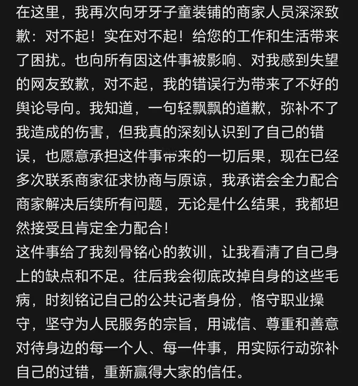 退脏衣服的记者王某已全网社死,正脸曝光很白净,可惜坏到骨子里,就连山东文旅也受到牵连。 几十块钱的衣服,对于一名记者来说应该不是什么贵重物品,却因为买了第二件却把第一件已经脏的衣服退换,按道理说属实想不通这一翻操作。 看了她的道歉文案,全程没有真心的忏悔,只是避重就轻,全部推给了孕激素的问题,这时候倒是展现了记者的文案功底,却把为人民服务作为信条完全抛到脑后。 人长的漂漂亮亮白白净净的,确是很恶毒,咒骂别人家的孩子,却不为自己刚出生的孩子积口德。 作为王某的单位迅速与其割裂,生怕受到任何影响,网友为了出一口恶气,纷纷跑到文旅下面留言,要求严惩。 任何人都会犯错,只要犯了错真诚的道歉,大都会被真心原谅。 像这位王大记者,网名“小仙女”,做出小仙女的事就该真心道歉,为童装店恢复名誉并积极赔偿,并不是发段避重就轻的文案就算道歉。 这次,她肯定会记一辈子吧,被单位辞职,自己被网暴,孩子没奶吃,说不定还会受到家人的埋怨,你就真差这几十块钱吗,何必呢?