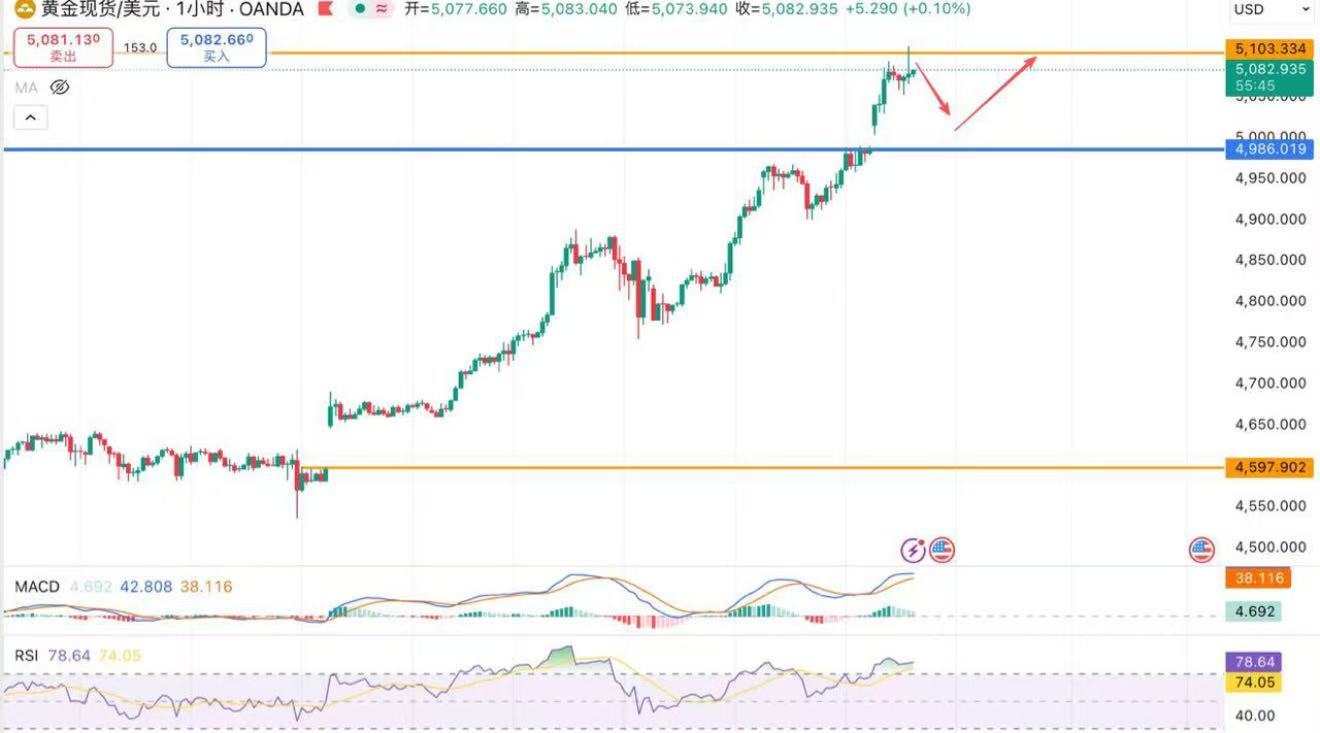 黄金关键位+操作思路分享(更新):支撑位:首要:5030-25美元附近(日内低点