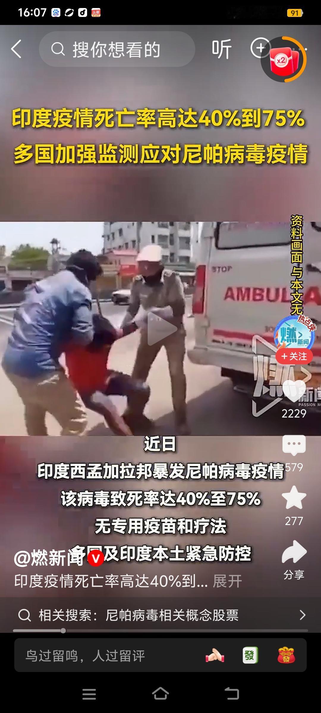 泰国全面筛查来自印度尼帕病毒风险航班,中国不能大意以避免当年新冠悲剧重演。 印度又爆发致死率最高达75%的尼帕病毒疫情,泰国为防止印度尼帕病毒疫情蔓延到国内,已从26日开始全面筛查印度西孟加拉邦到泰国的航班。 尼帕病毒主要攻击人的大脑和肺部,感染后症状包括发烧、头疼、嗜睡、昏迷、和意识模糊等,能够人传人。 现在印度每月至少有5万人入境中国,加上中国春节临近,我们也应该加强对入境的印度人的筛查和监测,避免当年新冠悲剧在中国重新上演。