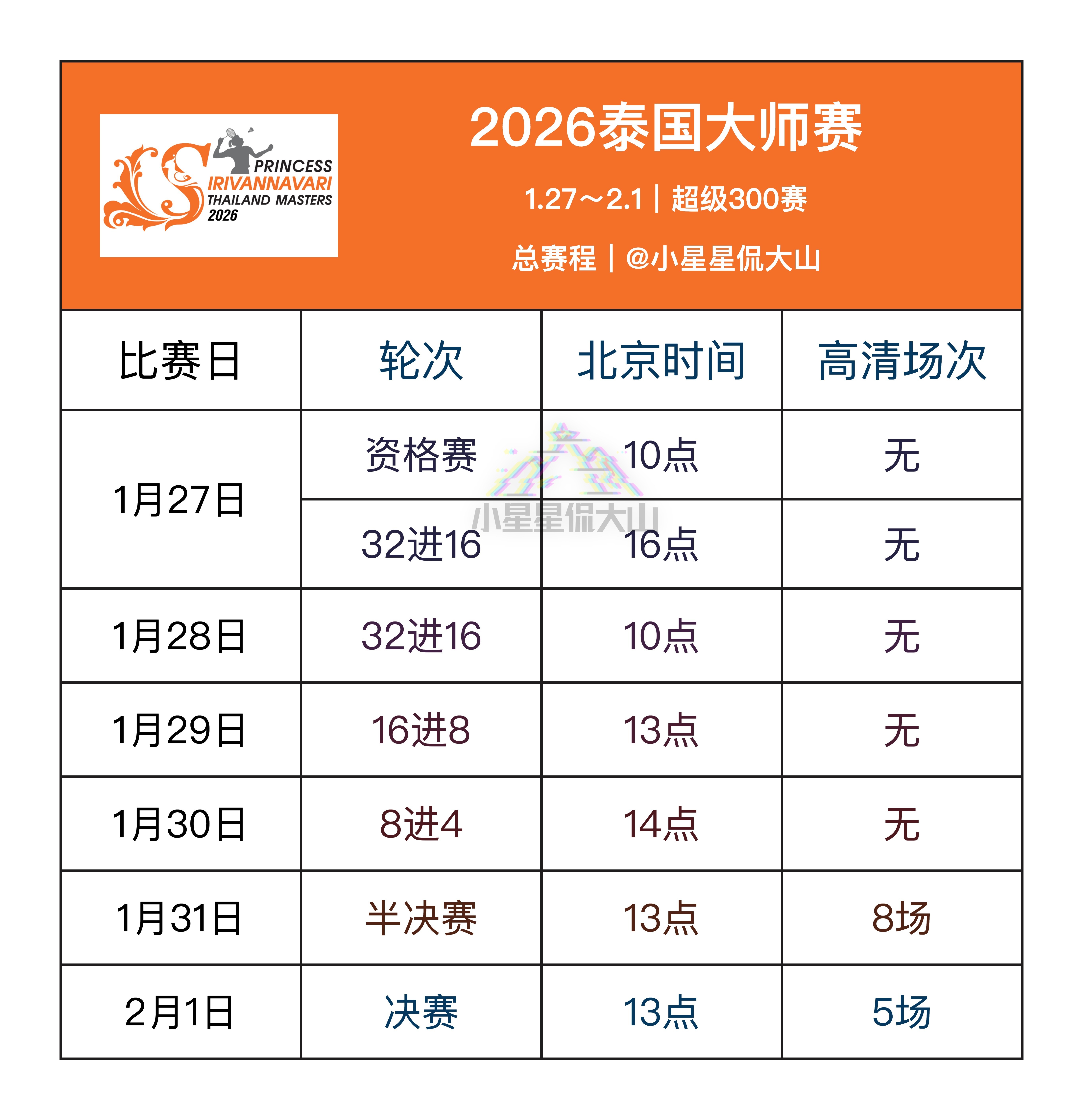 2026年泰国羽毛球大师赛 1月27日资格赛+男女双32进16赛程,早上10点开