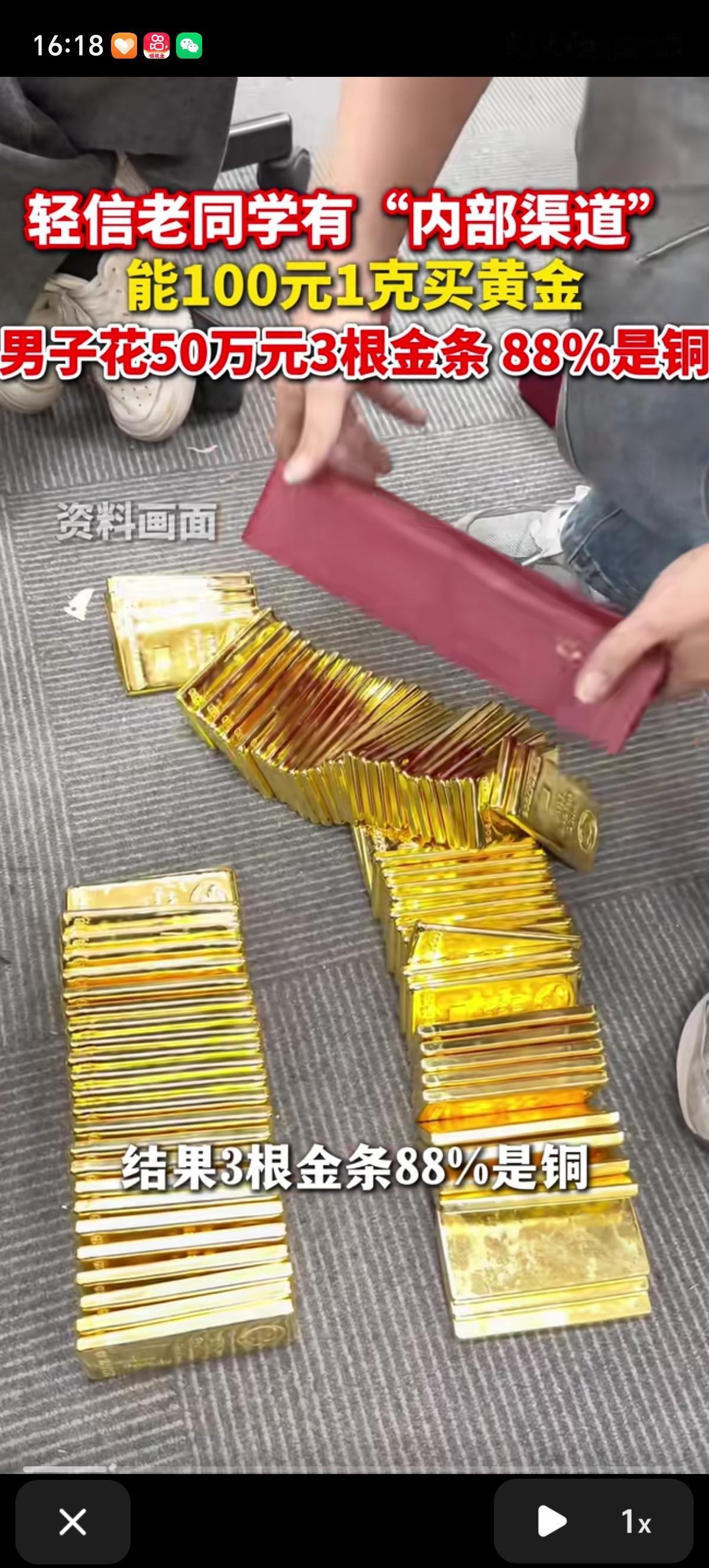 江苏王先生的老同学杨某告诉他有内部渠道可以100元一克的价格买到黄金,王先生相信了,先后给了老同学50万元购买。交货时间一拖再拖,王先生忍了,总算拿到了3根金条。 王先生一看金条,觉得颜色太鲜艳了,敲击声也不太对,找人鉴定发现金条是假的,内里88%是铜,就报警了。 事后扬某交代自己是因为资金周转困难才骗人的,假金条是网购买的。目前50万元的款项已经全部追回了。