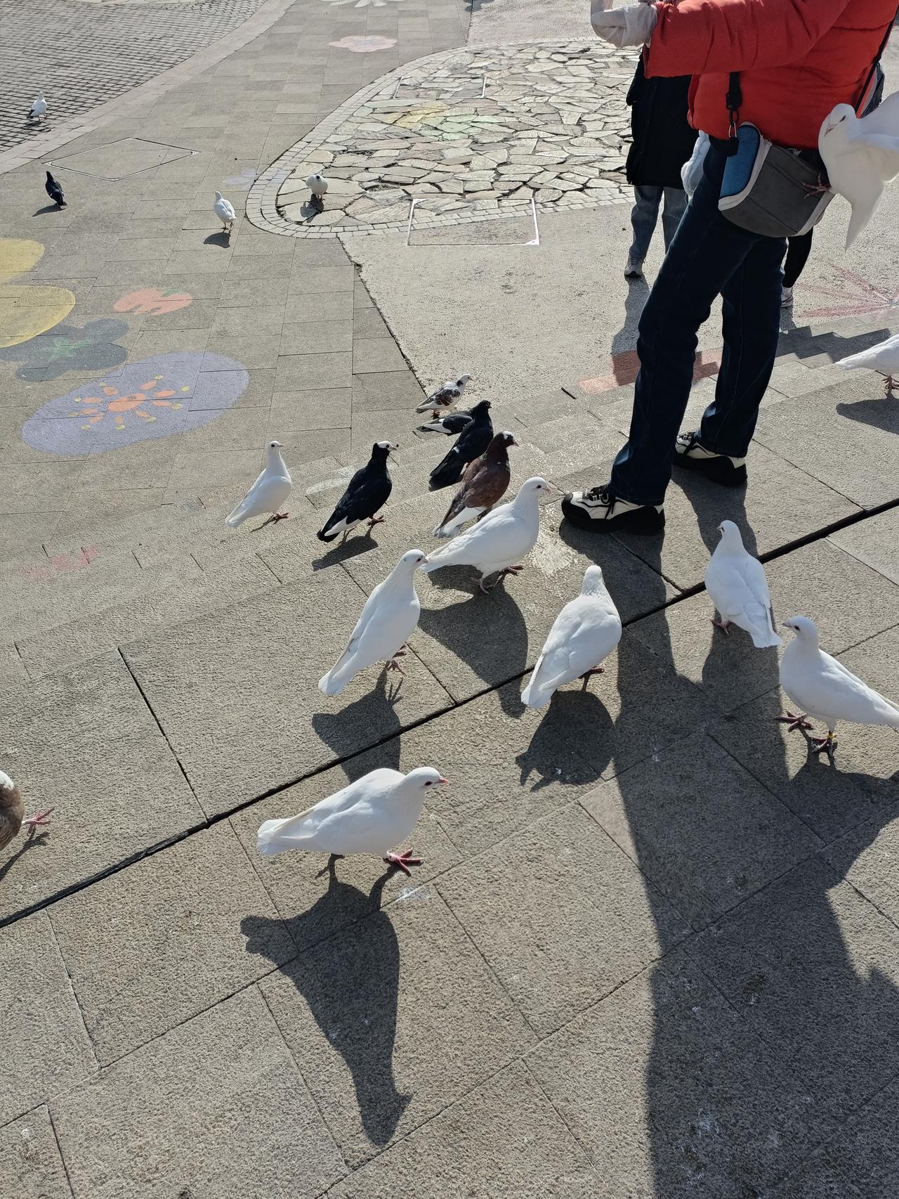 记录我的2026非常漂亮的鸽群,各种样式,有大尾巴的,有扁尾巴的,颜色各异,而且很喜欢和人们交流,只要往那一站,大群鸽子会奔你而来,有的落在你肩上,太可爱了