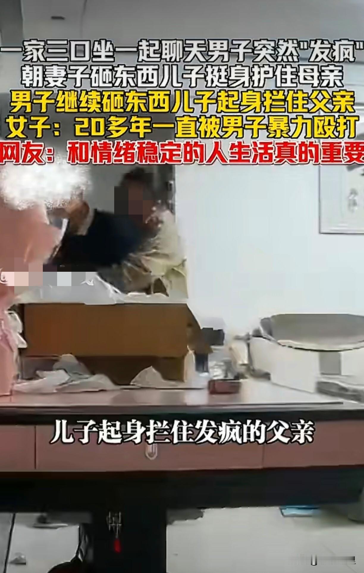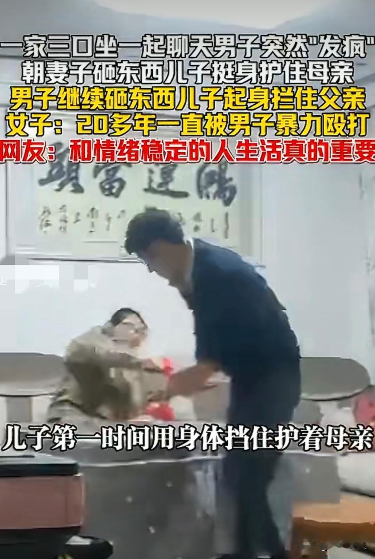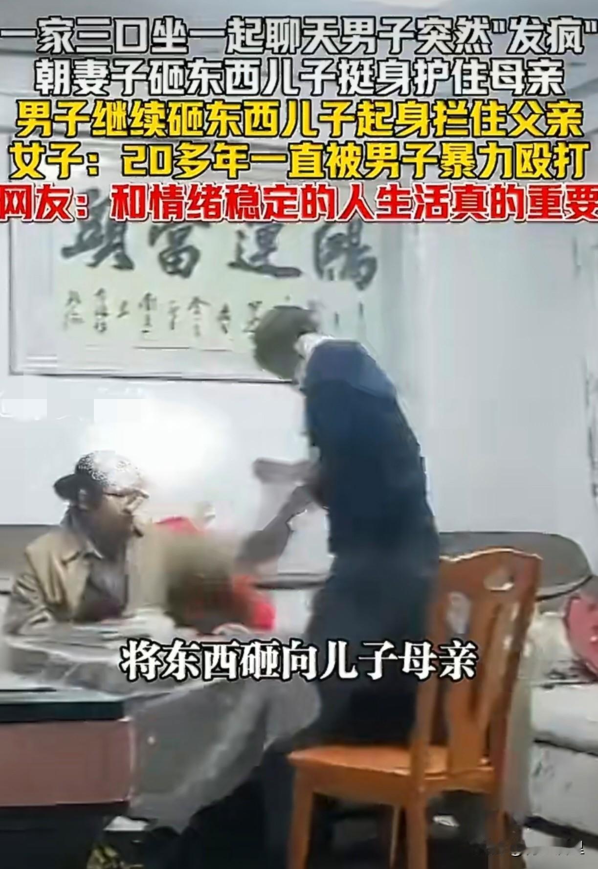 一段家中监控视频,让人看得揪心。 1月25日,贵州一户人家里,一家三口原本坐在一处聊天。突然,坐在一旁的丈夫毫无预兆地“发疯”,抓起手边的物品就朝妻子砸去。 妻子受到惊吓,一时无法动弹。千钧一发之际,旁边的儿子立刻起身,用身体护住了母亲。 本以为父亲的怒火会就此平息,没想到他并未停手,反而继续砸东西。这一次,儿子选择直接站起来,挡在了父亲面前,坚决阻止他进一步伤害母亲。视频中,妻子后怕地表示,自己二十多年来一直遭受着这些。 二十年的隐忍,换来的是变本加厉。情绪不稳定,在婚姻里真的不是小事,而是一场可能危及身心的潜在灾难。 选择伴侣,财富相貌或许是考量的一部分,但是情绪的稳定真是不可忽视的重点。选对了伴侣,可以说就是选择了一生的风水。