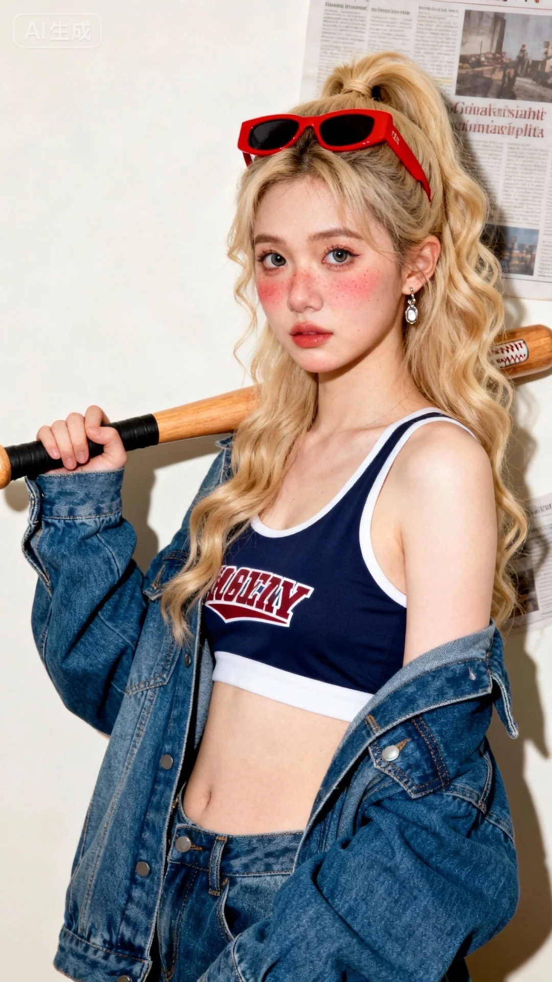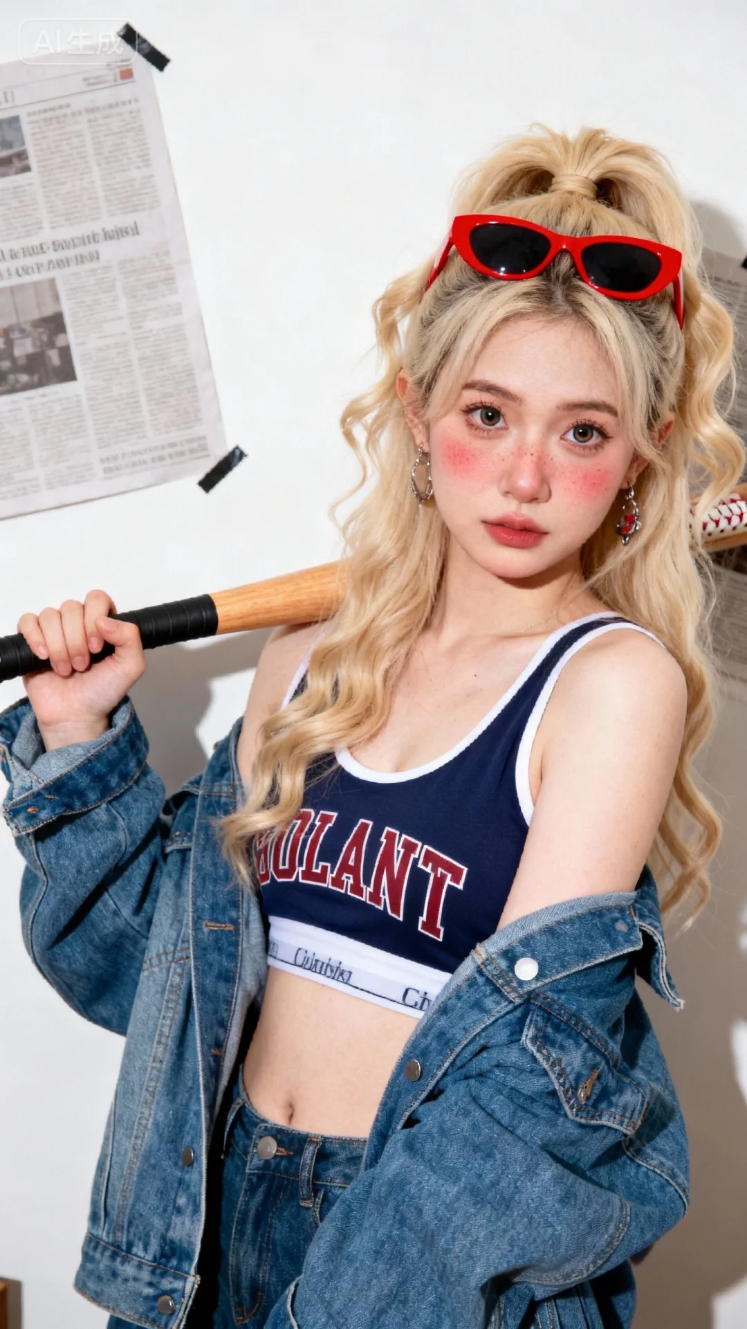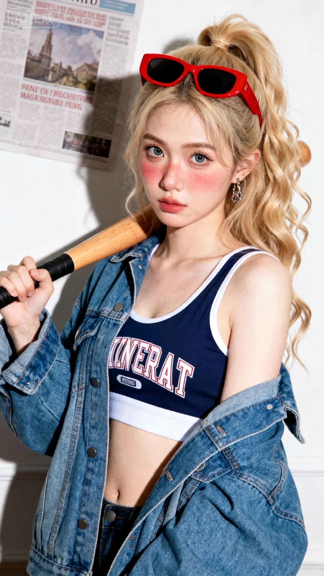 超高颜值美少女,网感头像,瓷白肌肤、奶油白肌肤,无辜大眼睛,微醺,自然松弛,网感妆,自然光线,暖调滤镜,少女感网拍,双颊微微泛红,概念风美学,情绪氛围感,聚焦眼睛,慵懒氛围感,脸部轻微曝光,独特韵味的美,耳饰,运动字母背心搭美高复古蓝慵懒风牛仔外套,手拿棒球棍放肩上,姿势随性慵懒,金色半高扎长卷发,头戴红色边框墨镜,室内纯色背景(贴报纸),站立,随手一拍、抓拍