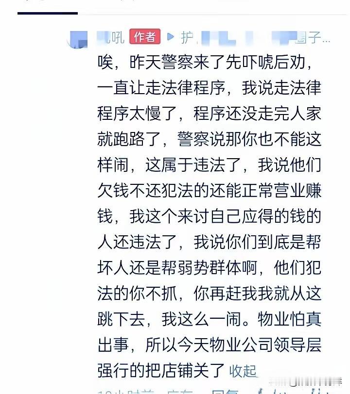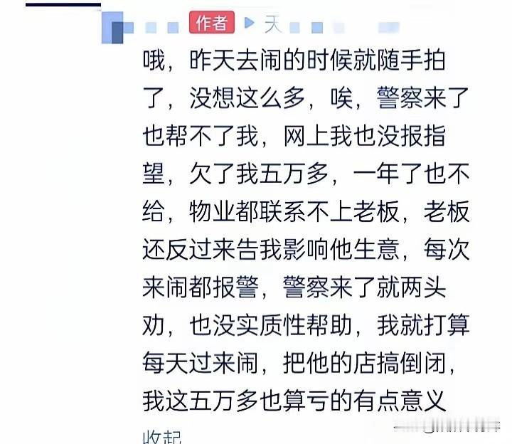 广州一家餐饮店拖欠一名员工5万多块钱工资已经一年多了,但是老板一直不给,也不露脸,员工找不到他。员工实在没有办法了,就每天拿个喇叭到他的店门口播放,搞到他生意也难做。 广州天河商圈人挤人,有个穿洗得发白工服的男人蹲在餐馆门口,手里捏着个大喇叭。喇叭的声音被商圈的噪音裹着,却字字扎耳:“这家店老板欠我五万块血汗钱!一年了都不给!” 路过的人要么掏出手机拍视频,要么皱着眉绕路走。店里的服务员端着菜躲着门口的客人,店长捏着对讲机,脸都绿了。谁都看得出来,这不是找茬,是真走投无路了。 说起来讽刺,去年这家店还火得要排队半小时,老板在短视频里说大话,说开了十几家分店,要让每个员工在广州站稳脚跟。结果呢?十几家店倒得只剩这一家,老板直接玩失联,警察来了都不露面。 那员工说,他去劳动局问过,走仲裁至少要等三个月。等流程走完,这家店说不定早就卷钱跑路了。五万块,是他妈要做手术的钱,是娃下学期的学费,也是他在城中村挤了三年的房租。他等得起,家里人可等不起。 警察劝他,说这么闹违法,再闹要拘留。他直接怼回去:“他欠我钱不违法?凭啥他躲在后面潇洒,我要蹲局子?”这句话把在场的人都问住了。 我们总说“走法律程序”,可对打工人来说,那程序太慢、太花钱。就像之前深圳那个外卖员,被欠薪后直接爬了塔吊,消防员劝了三个小时才把他劝下来。有人骂他傻,可要是能好好拿到钱,谁会拿命去换? 更可笑的是,这家店墙上还贴着“以人为本”的标语。老板在朋友圈晒三亚度假的照片,员工却在寒风里举着喇叭喊工资。客人看这架势,都默默退了号不敢进来。物业怕出事儿,直接把店关了。可店一关,员工的工资更没影了。 再路过那家店,已经贴了“暂停营业”的通知。那个男人不在门口了,不知道是被劝走了,还是终于拿到了钱。但广州街上,肯定还有不少像他这样拿着喇叭讨薪的人,等着有人给个说法。 换作是你,你会蹲在店门口举喇叭,还是等三个月走仲裁?要是你是老板,你会躲起来当缩头乌龟,还是哪怕卖了店也先给员工发工资?评论区聊聊,看看大家都怎么说。