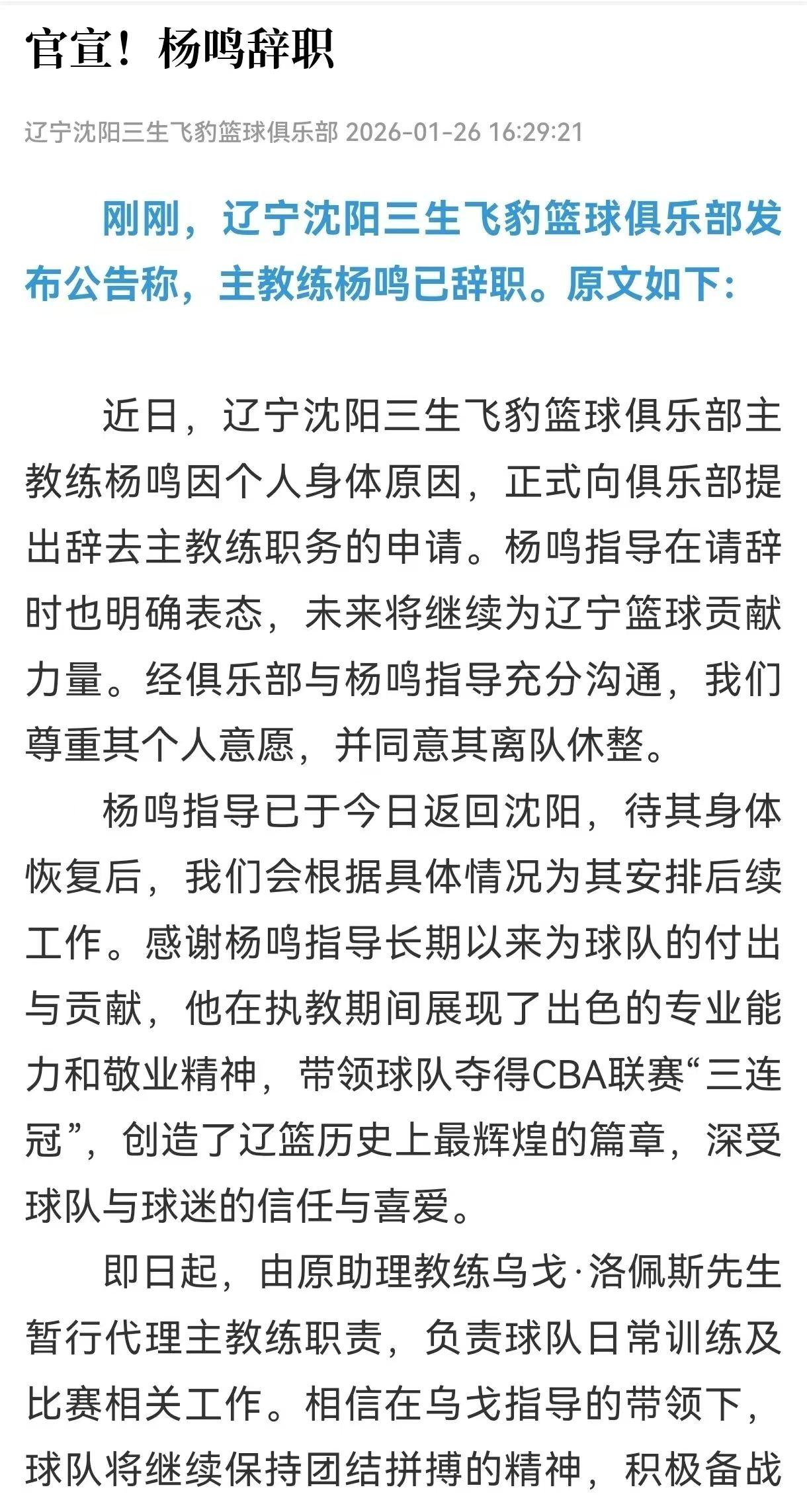 杨鸣辞职!辽宁辽篮重磅教练杨鸣因身体不适个人原因提出辞职,不过未来等身体好的时候继续服务辽篮,可以看出对辽宁这份热爱是不变的,但是辽篮的压力是巨大的! 公开资料看出这次辽篮CBA的比赛截至 2026年1月25日,辽宁男篮战绩为8胜11负,排名联赛第13位,已跌出季后赛资格区(前 12 名),正遭遇四连败,近 7 场比赛仅1胜6负,导致出现严重下滑的核心问题是球员,韩德君退役(内线支柱)、张镇麟转会(锋线核心)、郭艾伦离队(攻坚核心),加上刘雁宇、赵率舟等轮换离队,冠军框架完全破碎,而新的班底依然在磨练,导致现在进攻乏力,即便教练杨鸣努力挽回,但是‘巧妇难为无米之炊’,目前的辽宁辽篮的压力相当巨大,这次杨鸣辞职,再一次说明了辽篮要‘大破大立’,辽宁一直关注篮球和足球的运动,这次辽篮滑铁卢下滑,自然要教练背锅,但是后面如何崛起就要需要尽快计划球员斗志,球队稳健发展至关重要,辽篮需要一场胜利重拾信心! 加油,辽篮以及辽足,这都是成为文旅特色的一个亮点,也是丰富群众生活的赛事,更应该团结一心,加油向前!