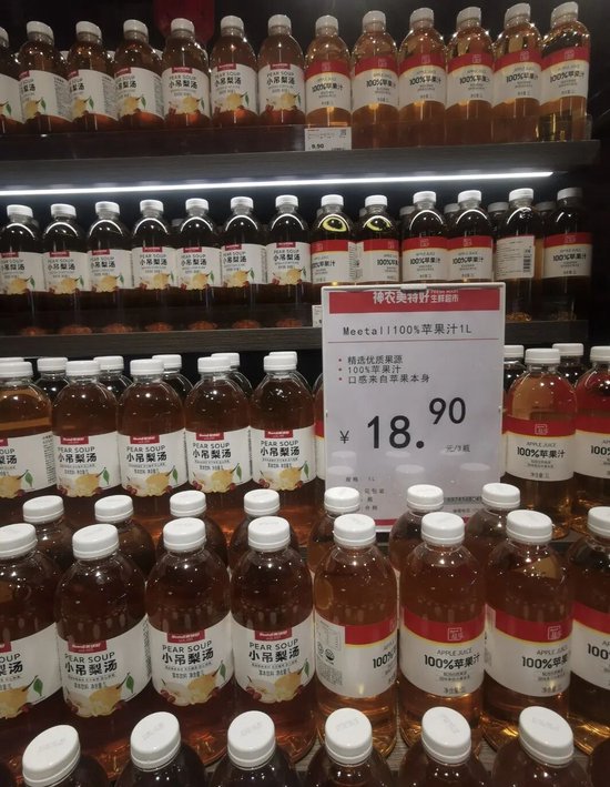 1月25日,美特好学习胖东来的门店重新开业,胖东来同款果汁在售。(图片拍摄:受访对象)